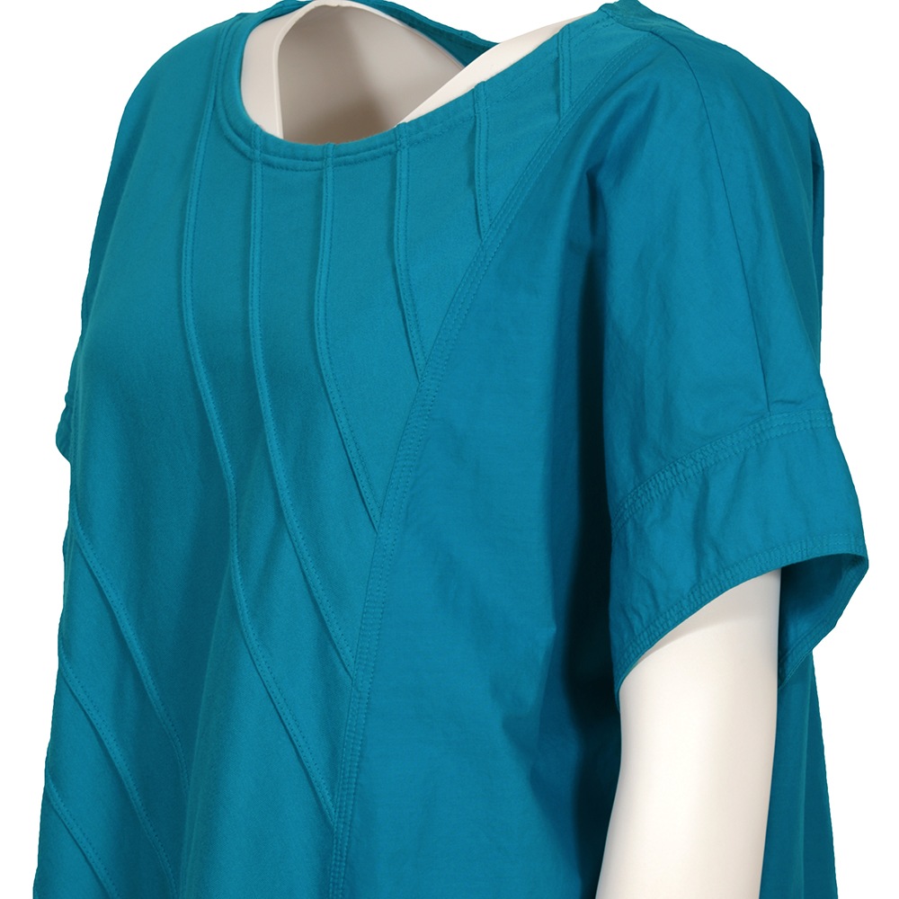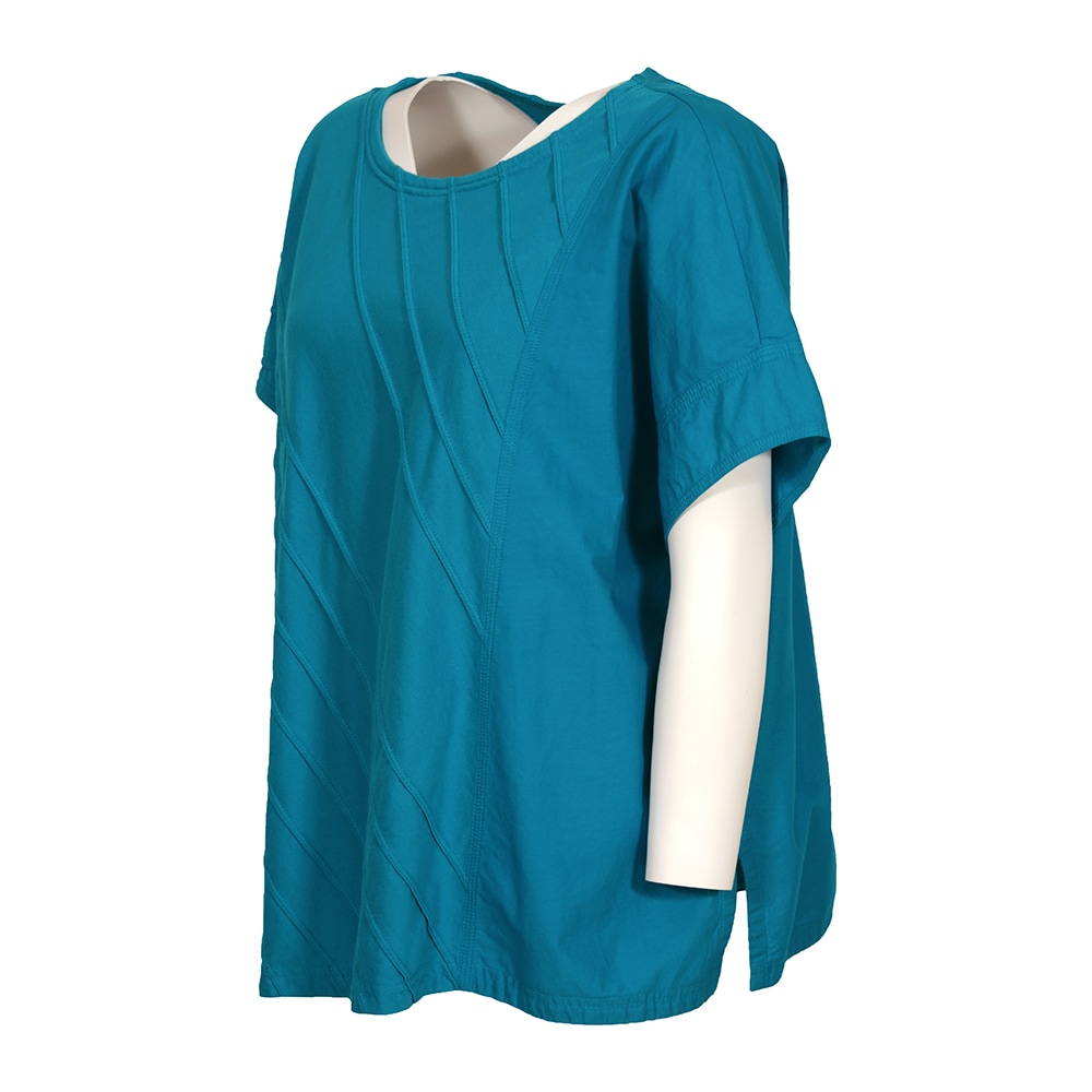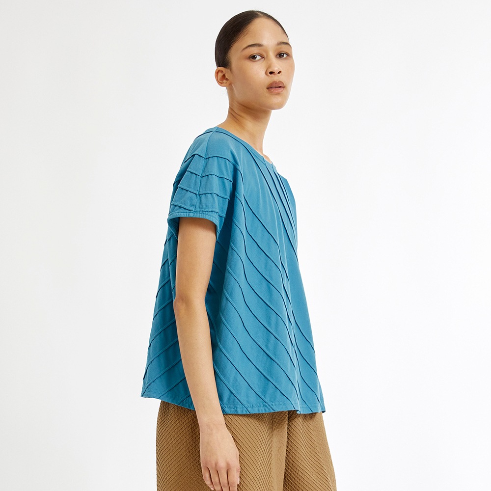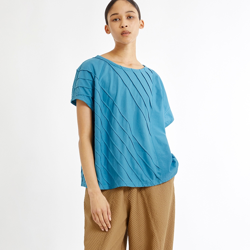 柔らかなカットソー素材にシャープなピンタックでアクセント。しなやかなローンのコントラストを楽しむアシンメトリートップス。
