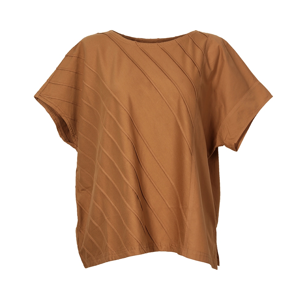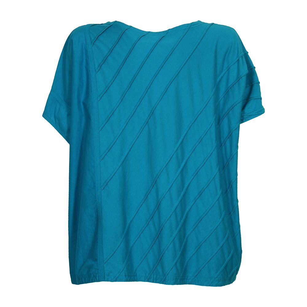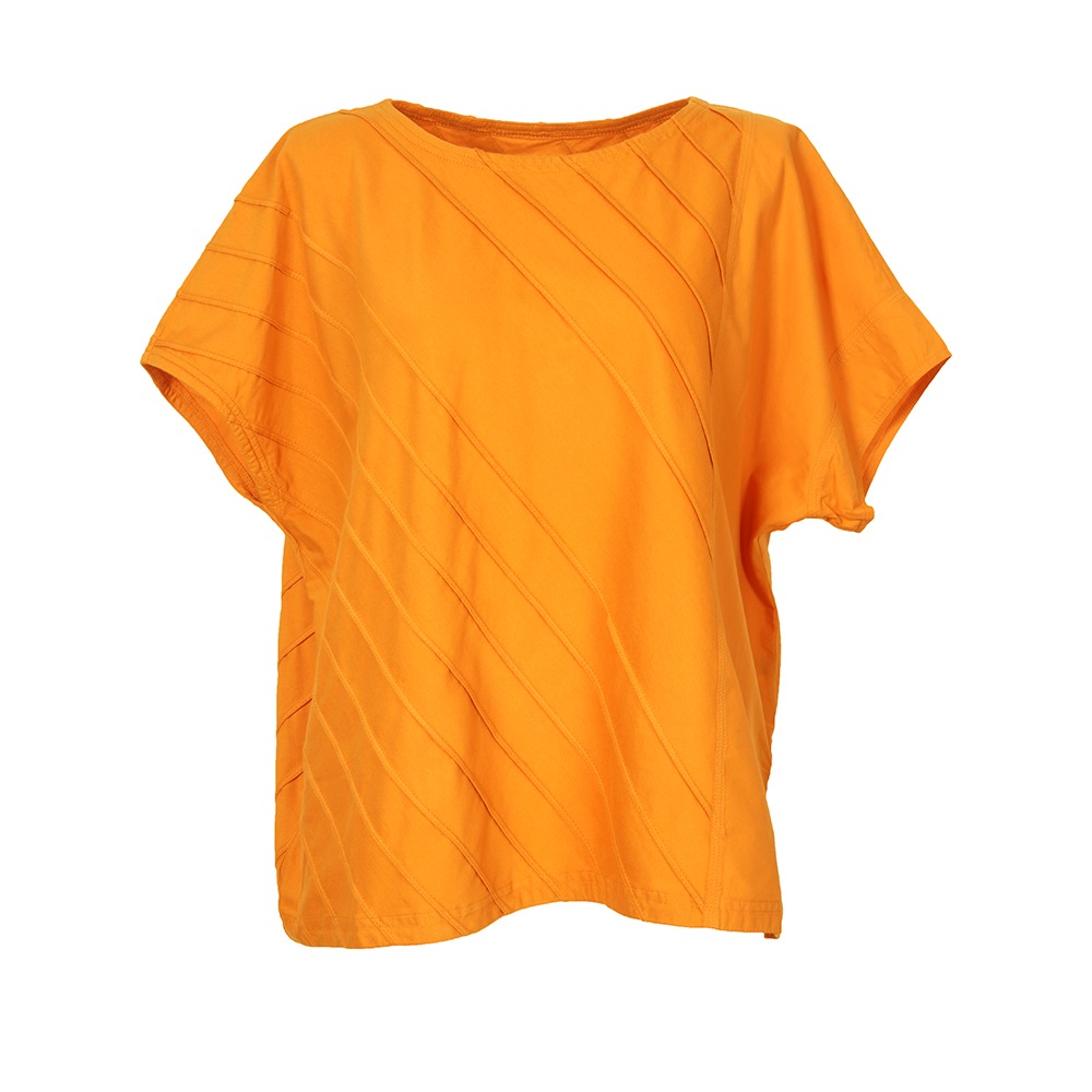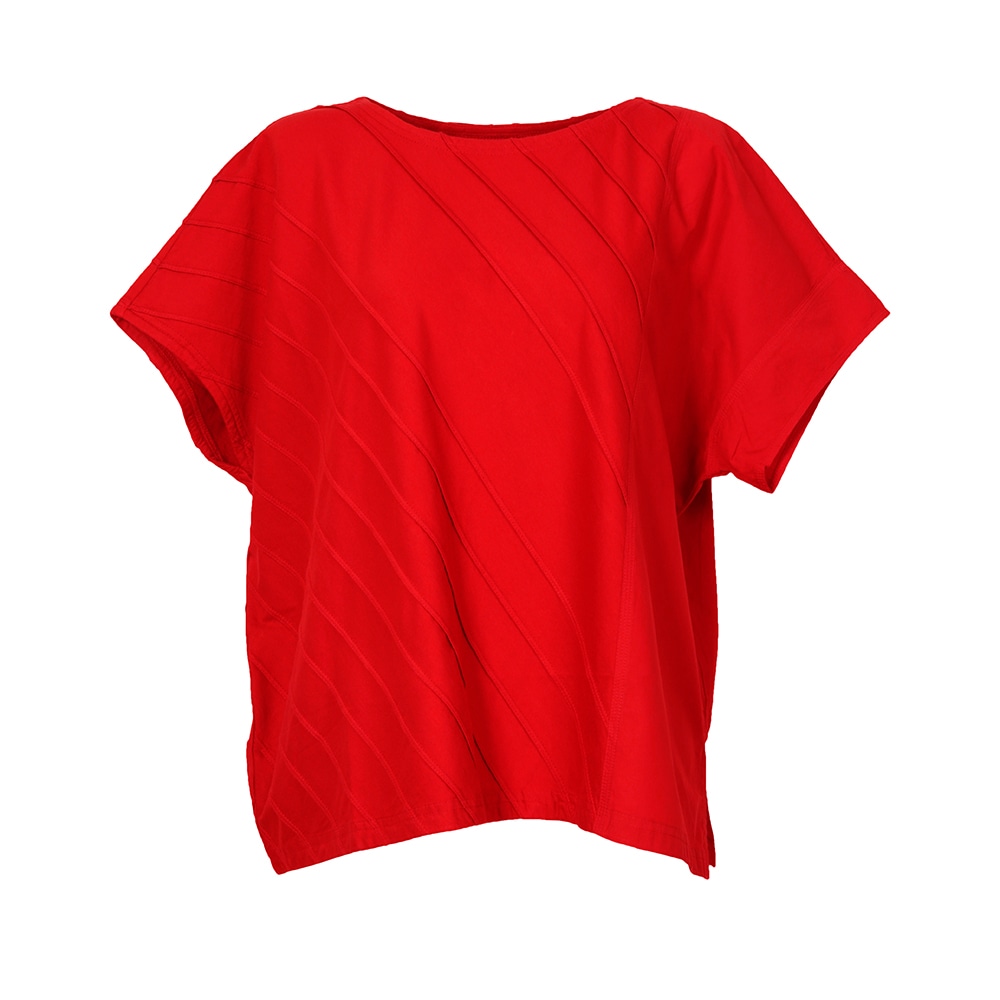 柔らかなカットソー素材にシャープなピンタックでアクセント。しなやかなローンのコントラストを楽しむアシンメトリートップス。