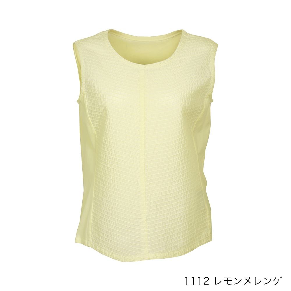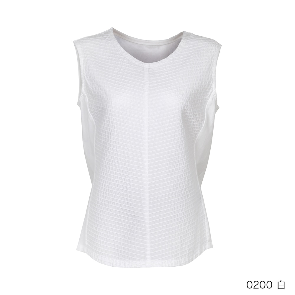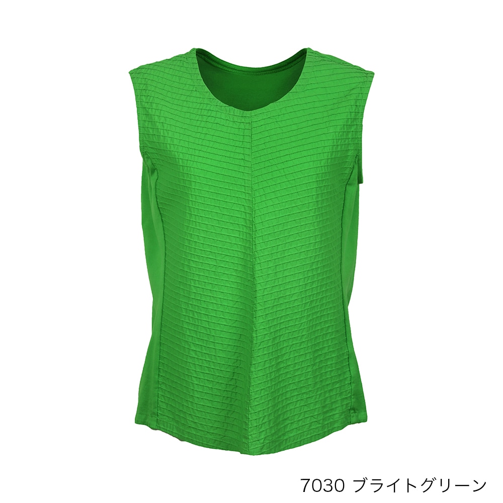 顔映りを華やかにするピンタックをフロントに、サイドから後ろにかけてカットソー素材を使った、身体なじみの良いタンクトップ。