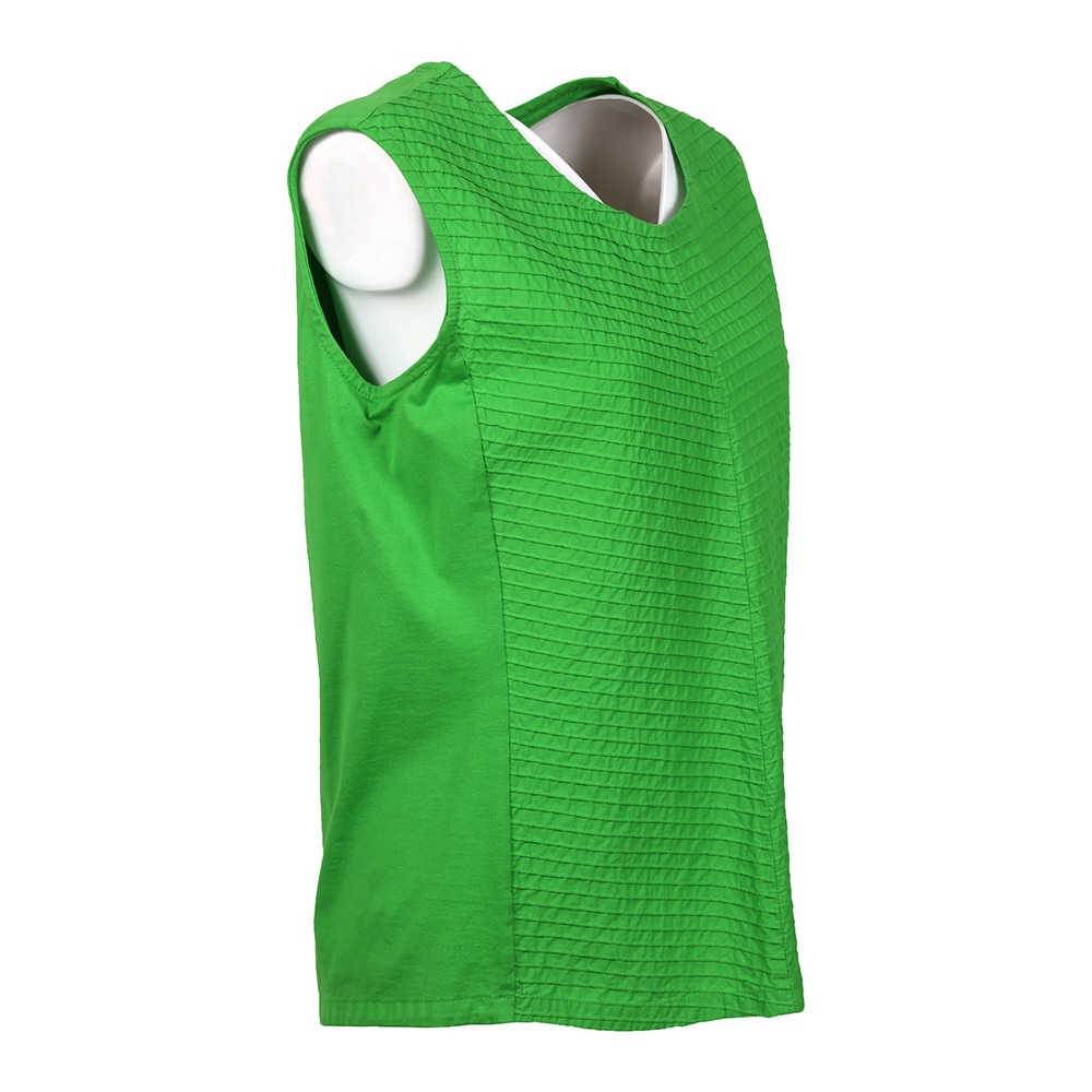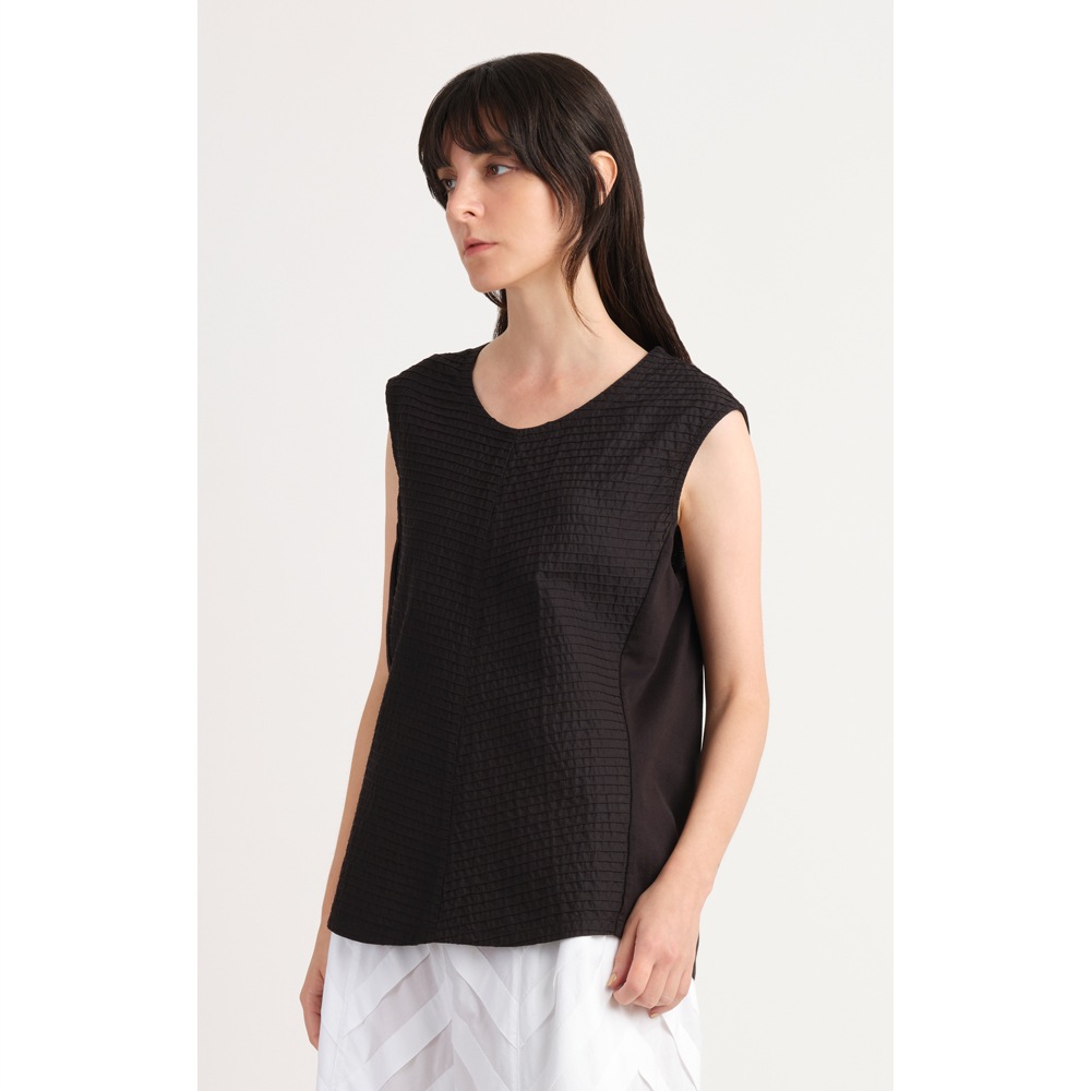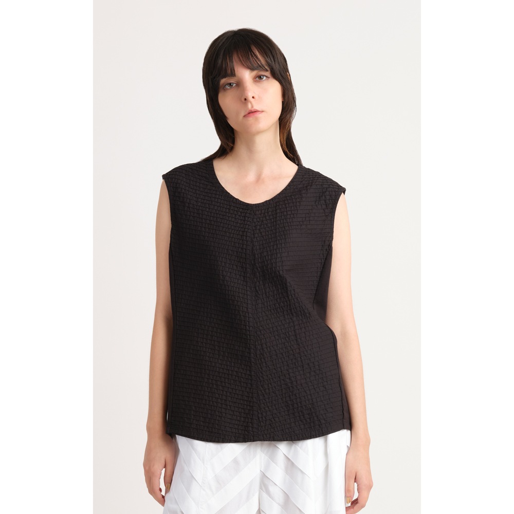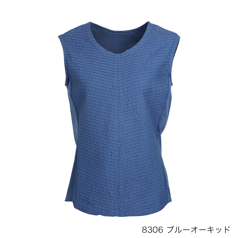 顔映りを華やかにするピンタックをフロントに、サイドから後ろにかけてカットソー素材を使った、身体なじみの良いタンクトップ。