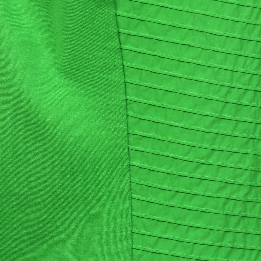 ややフロント側にまわりこんだサイドの切り替えと、ゆるやかな矢羽根柄を描くピンタックが、視覚的なスリミング効果を発揮する万能トップスです。