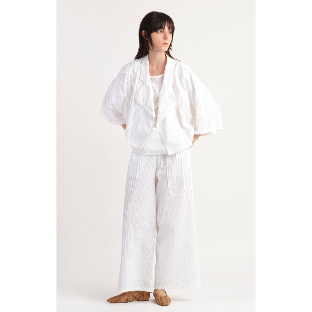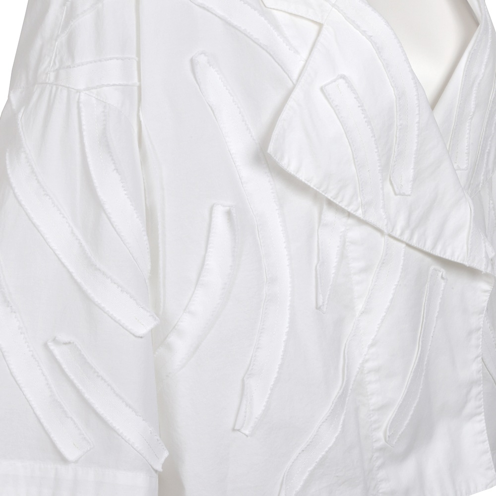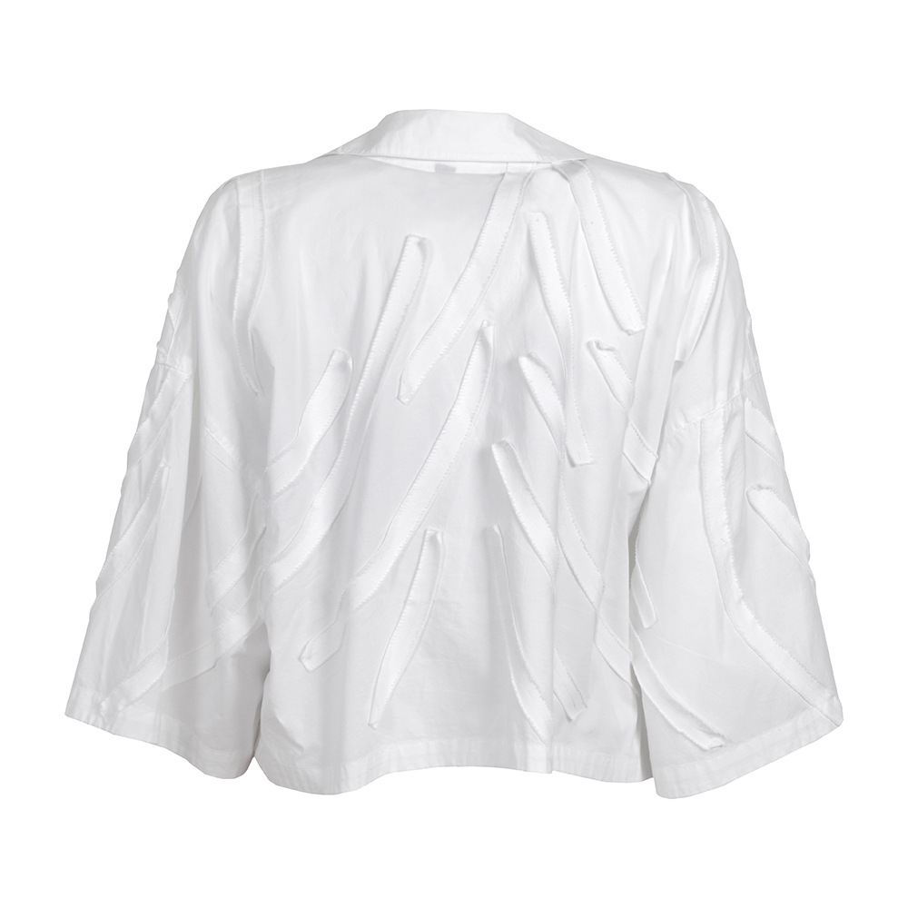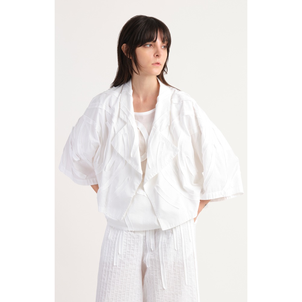 アイビーをイメージしたカツラギ素材のテープを、流れるように全体に配置したライトジャケット。