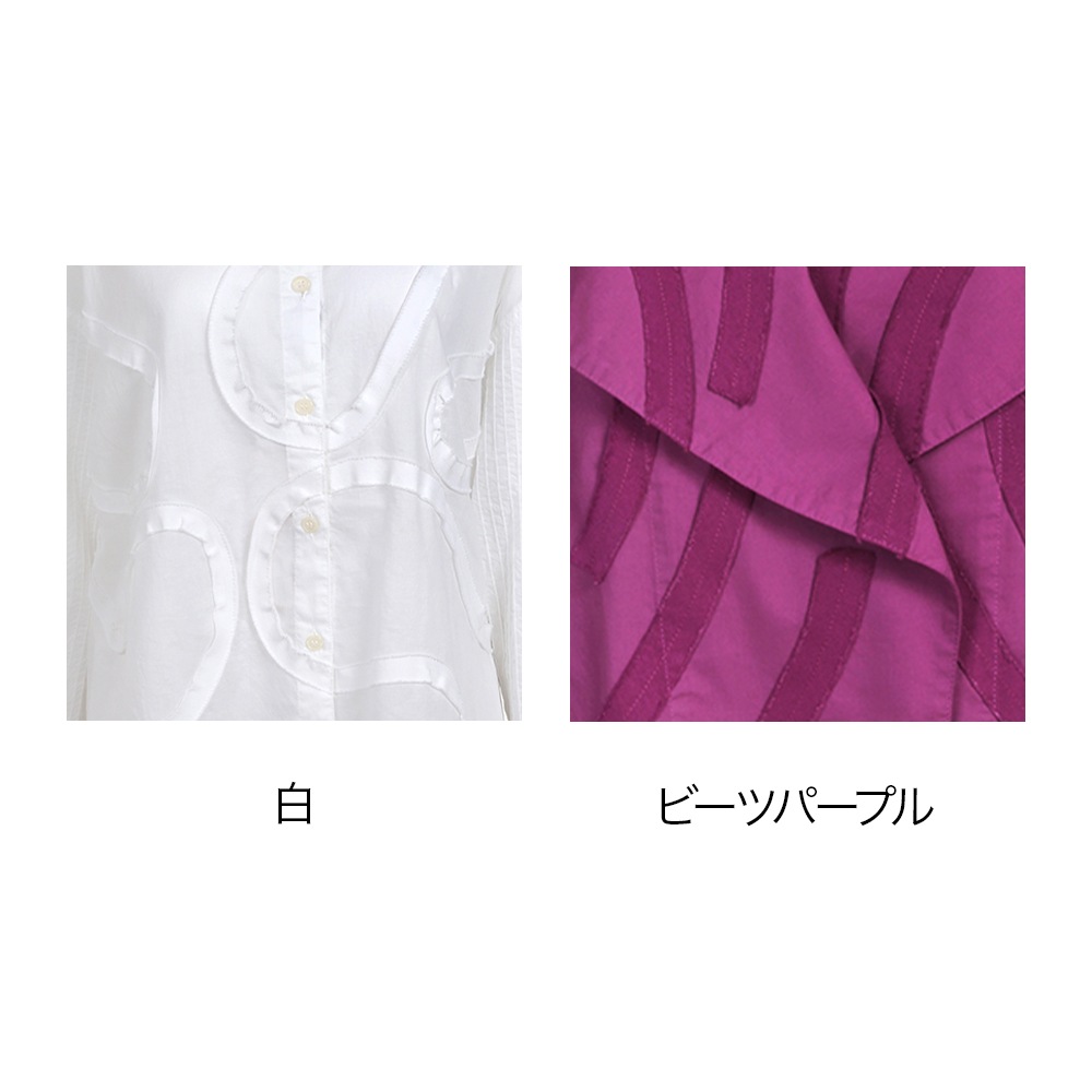 ネックラインになじむ大きめのテーラードカラーと、軽やかなボタンなしの前開きスタイルが大人っぽくエレガント。