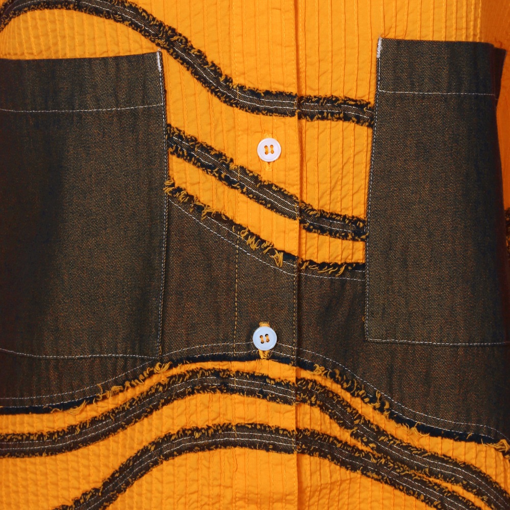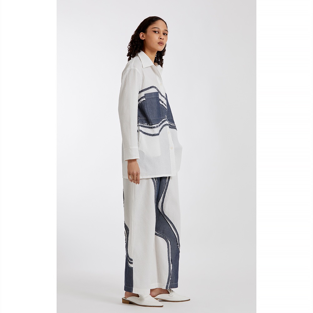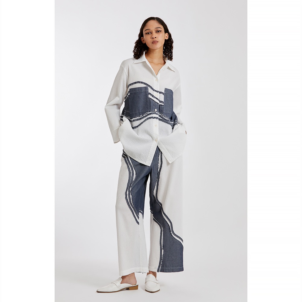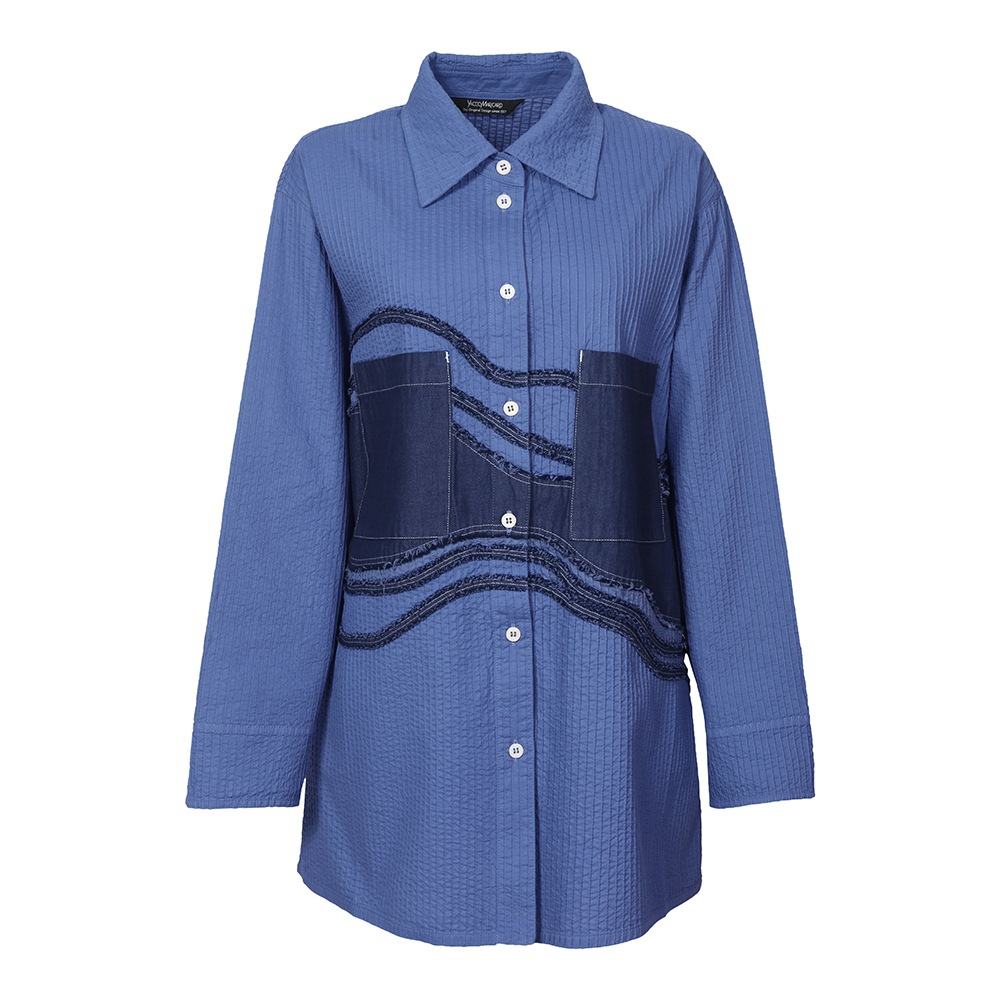 “枯山水”その大胆な表現に、静けさと同時に豊かさを感じさせる日本の伝統的な庭園。 石や砂で表される自然の美の感覚を吹き込んで、ピンタックとデニムを組み合わせ、質感とカラーにコントラストを持たせた枯山水シリーズです。 整然としたピンタックの中を流れるように渡る柄行は、インパクトがありながら落ち着いたモダンな雰囲気をまといます。ややオーバーサイズながらすっきりと見えるシルエットにこだわり、着姿が美しいシャツに仕上げました。芯のある佇まいと、柔らかな着心地が魅力。