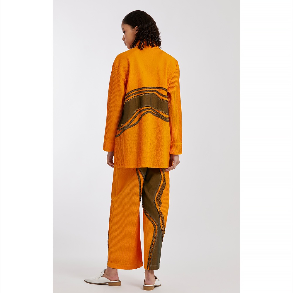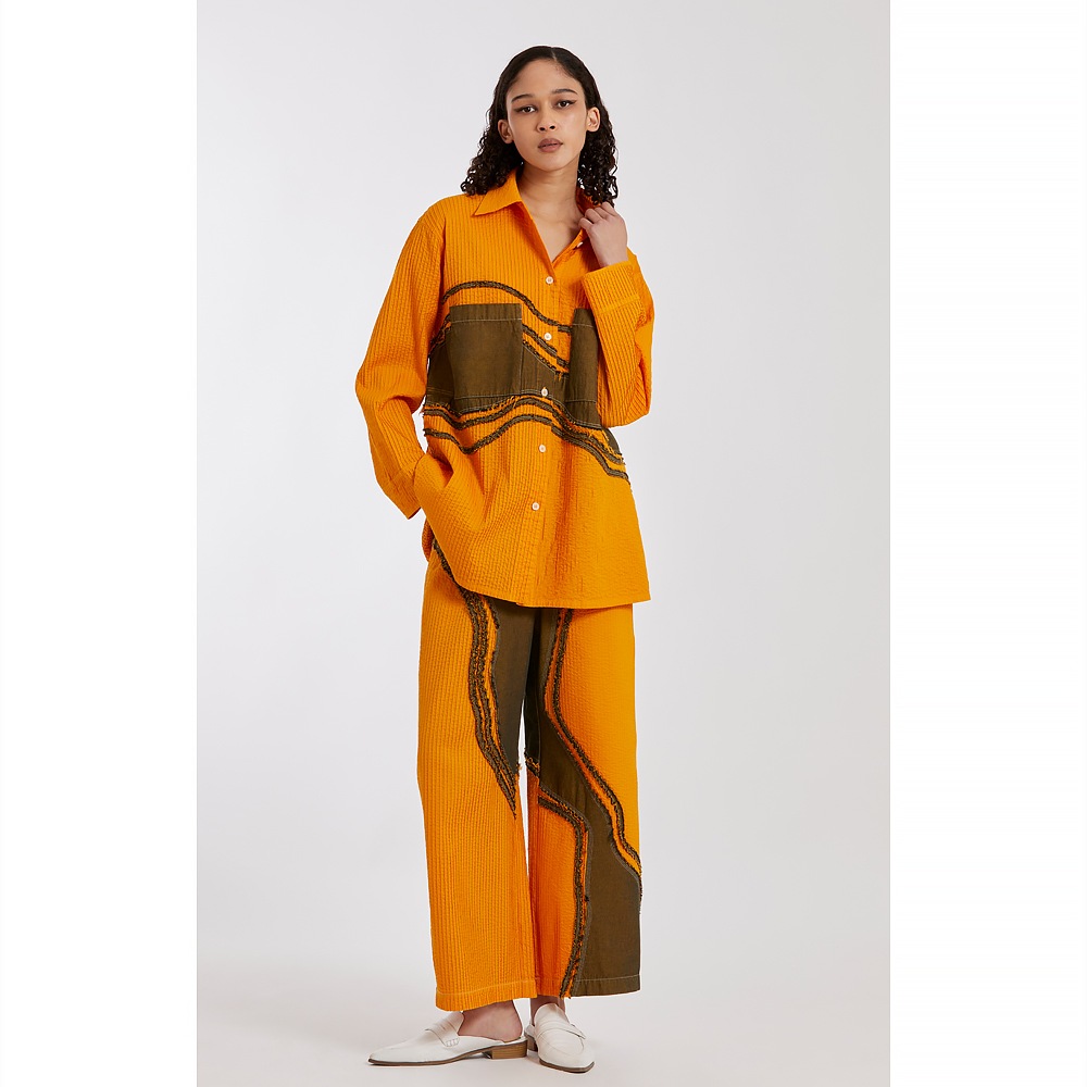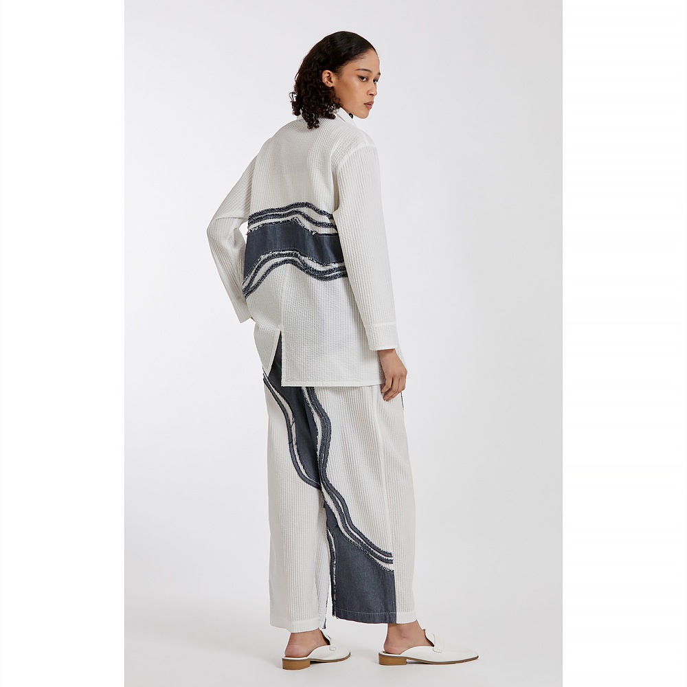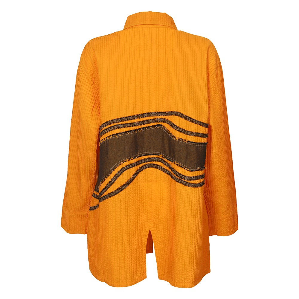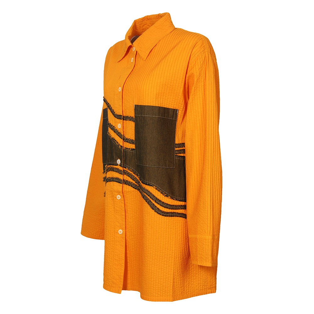 “枯山水”その大胆な表現に、静けさと同時に豊かさを感じさせる日本の伝統的な庭園。 石や砂で表される自然の美の感覚を吹き込んで、ピンタックとデニムを組み合わせ、質感とカラーにコントラストを持たせた枯山水シリーズです。 整然としたピンタックの中を流れるように渡る柄行は、インパクトがありながら落ち着いたモダンな雰囲気をまといます。ややオーバーサイズながらすっきりと見えるシルエットにこだわり、着姿が美しいシャツに仕上げました。芯のある佇まいと、柔らかな着心地が魅力。