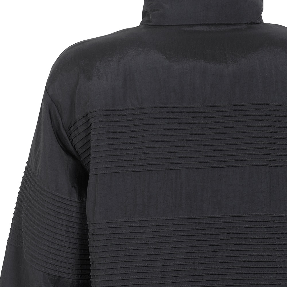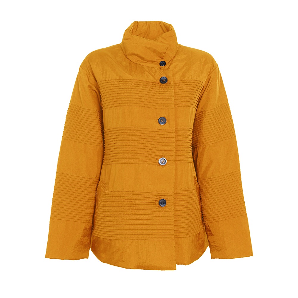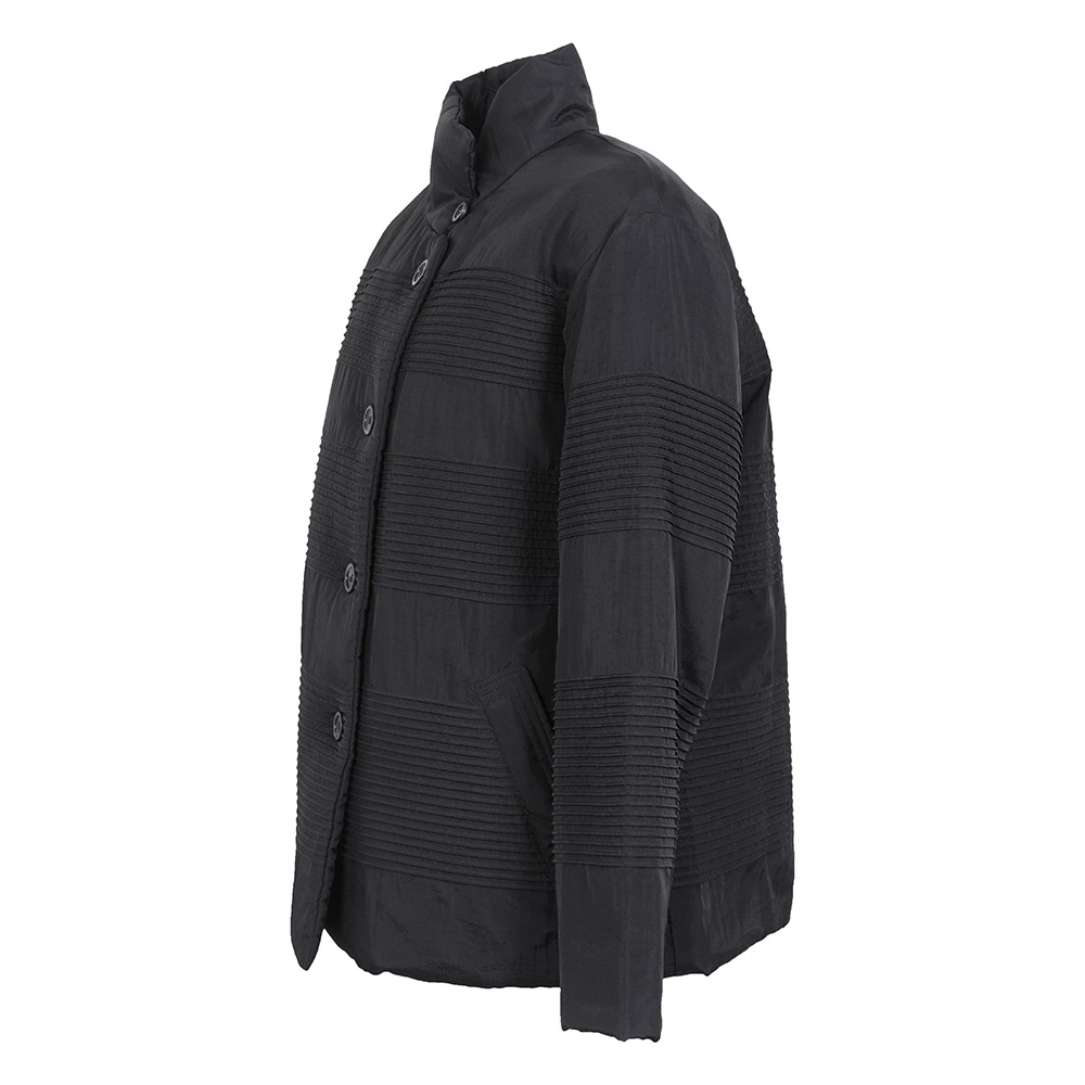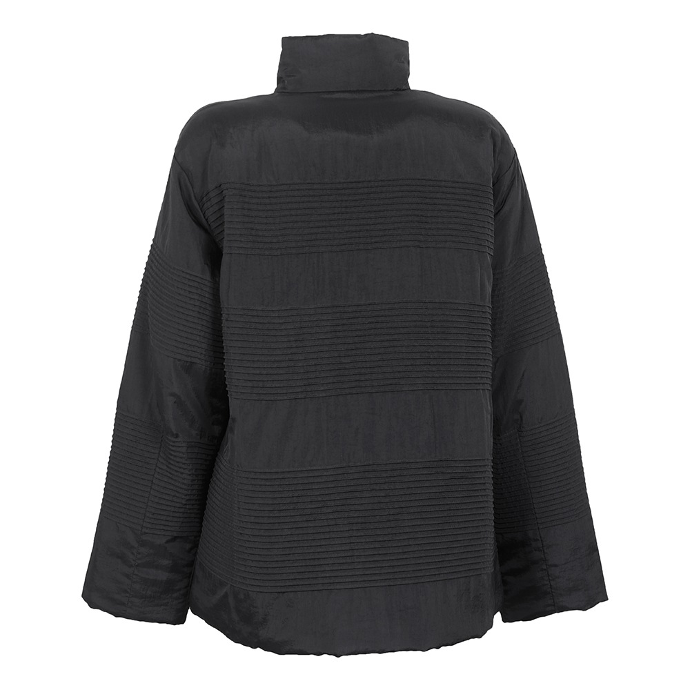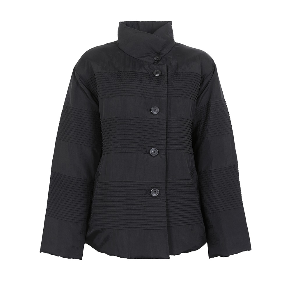 大胆なボーダー調のピンタックが目を引くジャケット。無地とのコントラストが効いて、全体的にスッキリと知的な印象のアウターです。 柔らかな着心地と、色々なボトムに合わせやすい丈感。 中わた仕様ですが着ぶくれせず、コンパクトなシルエットがきれいな1枚です。
