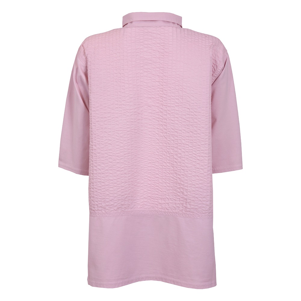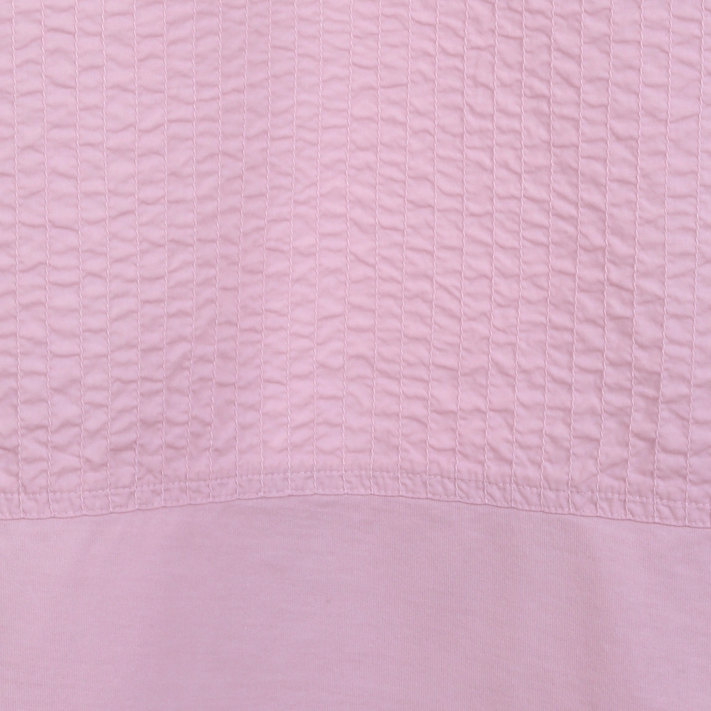 身頃のキャラコ素材にステッチを施し、裾、袖に柔らかいカットソー素材を使用した、着心地の良い襟付きプルオーバー。すっきりシルエットで、スタンドカラー風に襟を立てて着るとエレガント&シャープな雰囲気に。