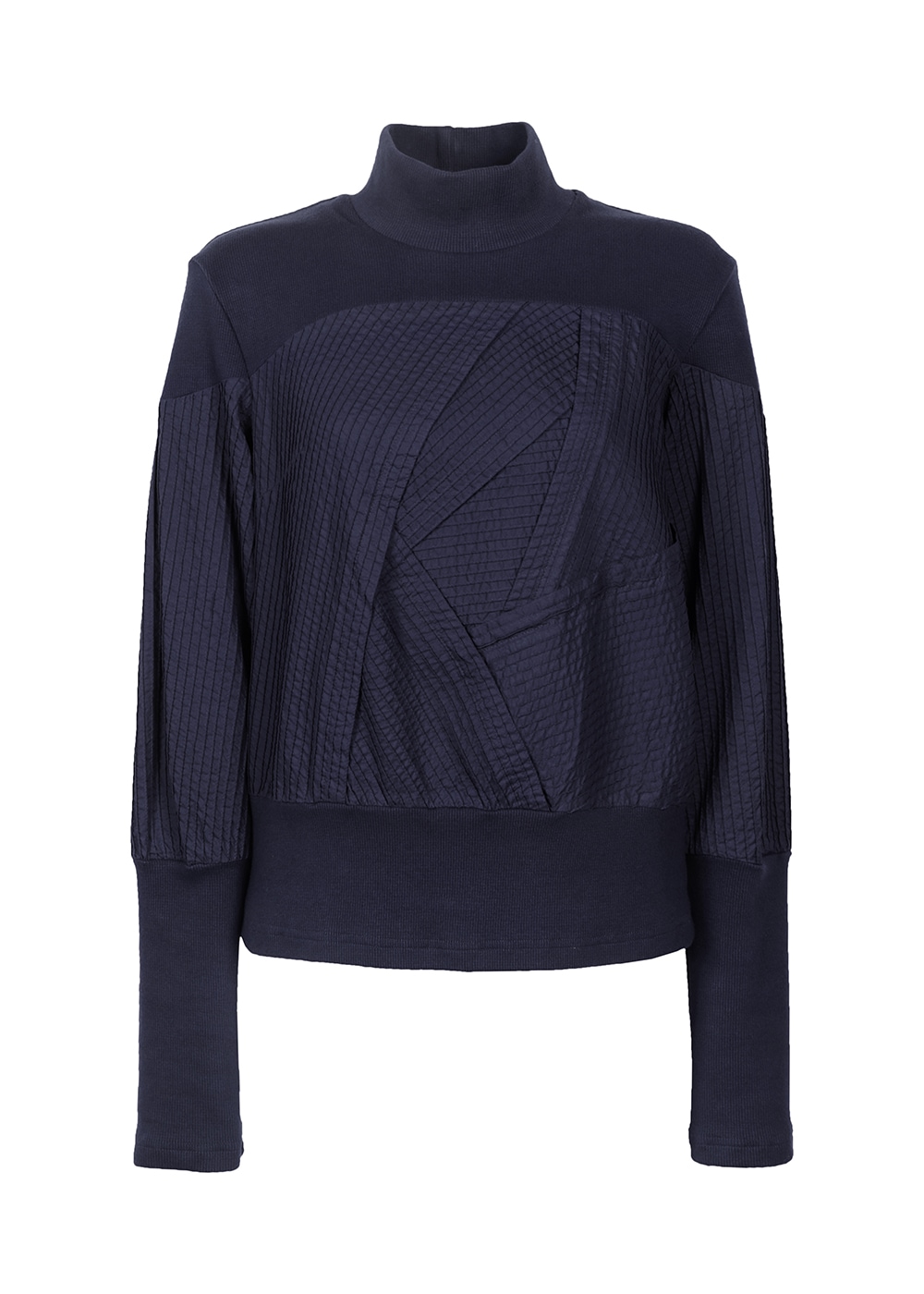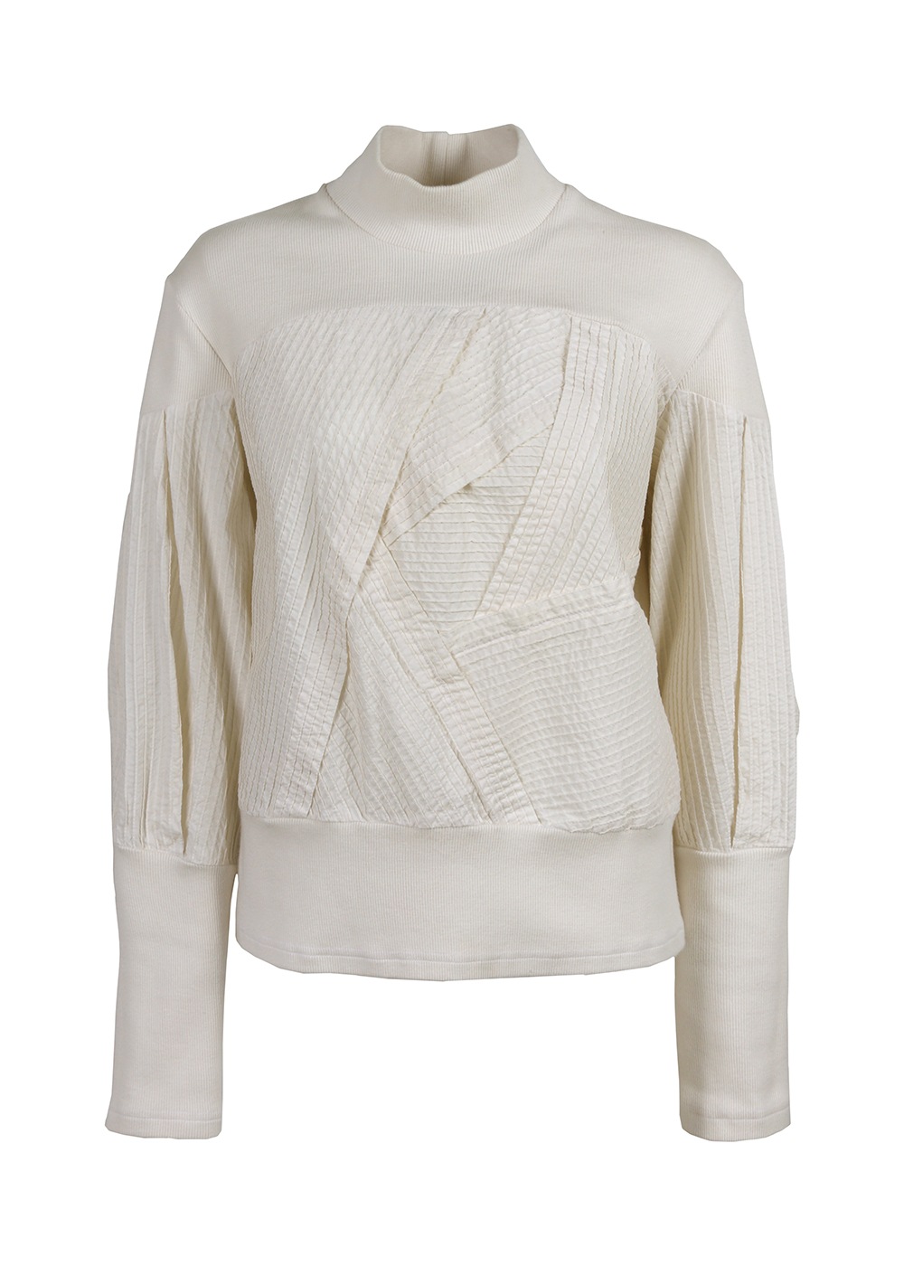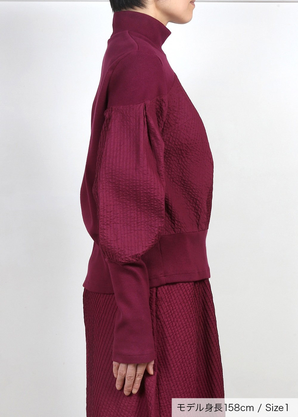 きれいにフィットしたリブカットソーの首元から、ピンタックを重ねて奥行きを持たせたデザインが印象的なプルオーバー。袖のリブを引き上げると、スリーブがよりふっくらとしたフォルムになり、印象の変化を楽しめます。部分的なボリューム感がありながら、全体はコンパクトでミニマムな雰囲気の上品なトップスです。