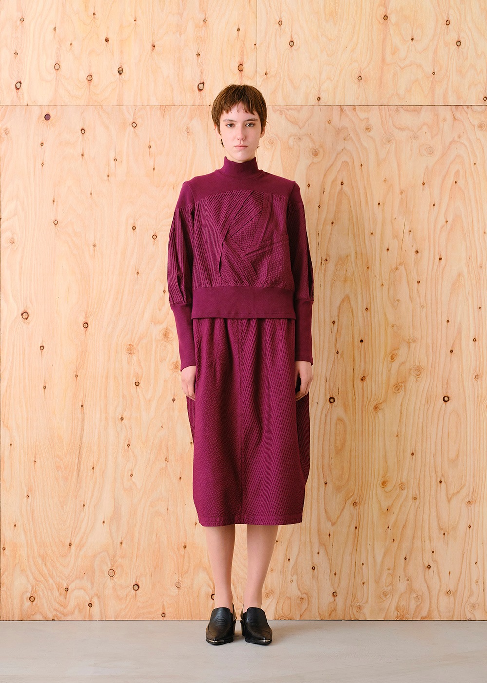 リブ編みのカットソーとピンタックをMIXさせて、フィット&ボリュームの新鮮なフォルムを表現したシリーズ。