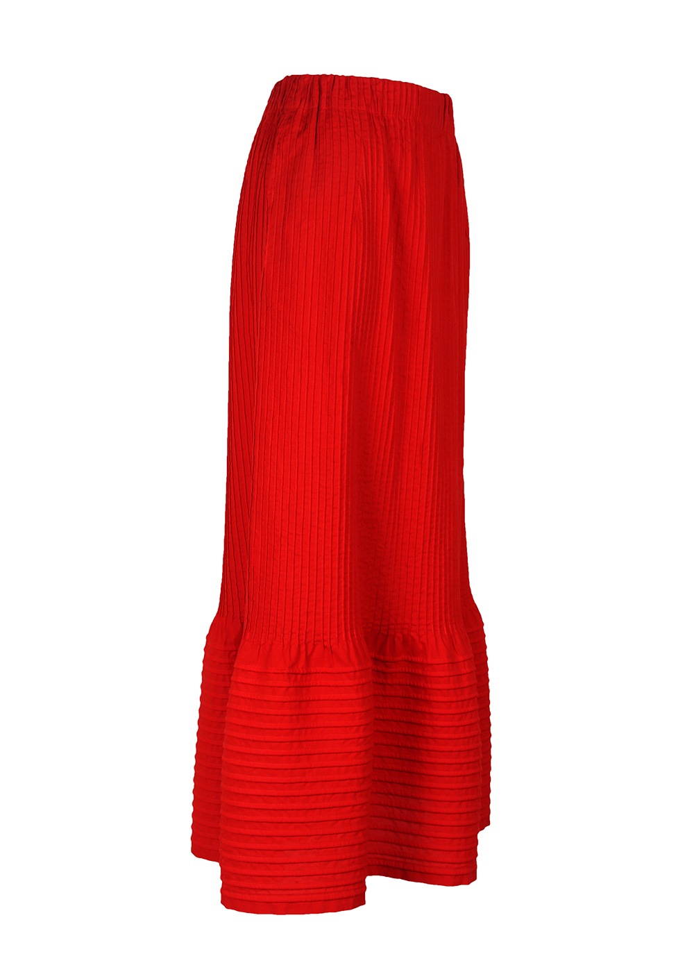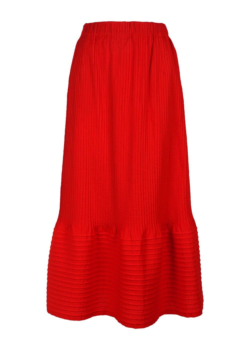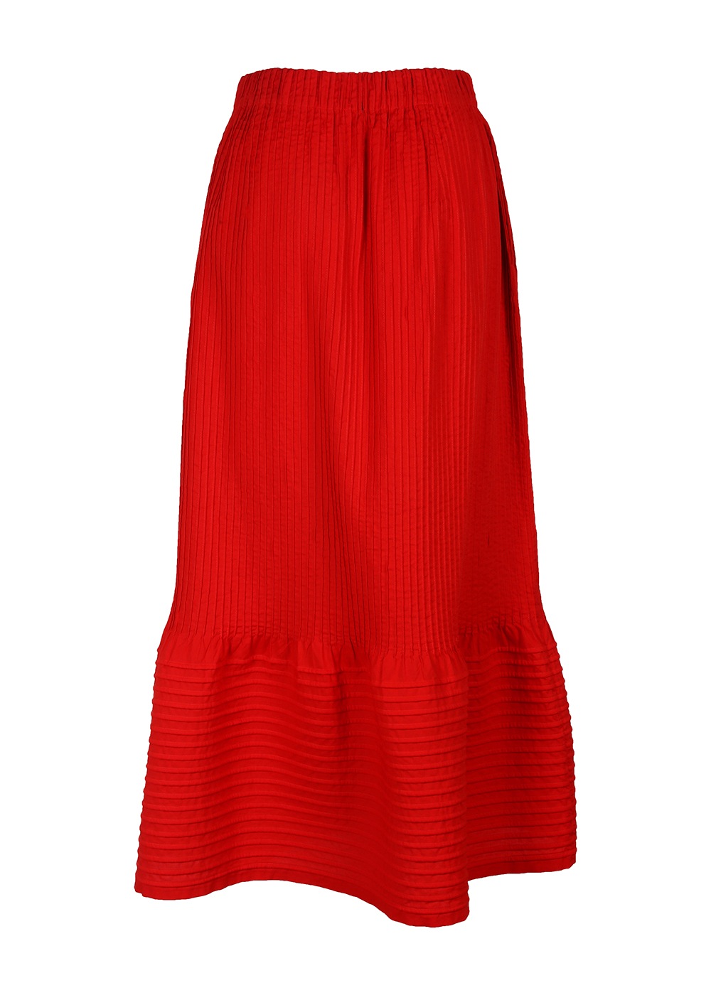 オリジナルのブティ(ピンタックの中にわたを入れ込む)テクニックで弾力のある生地を活かした、裾ボリュームデザインのスカート。