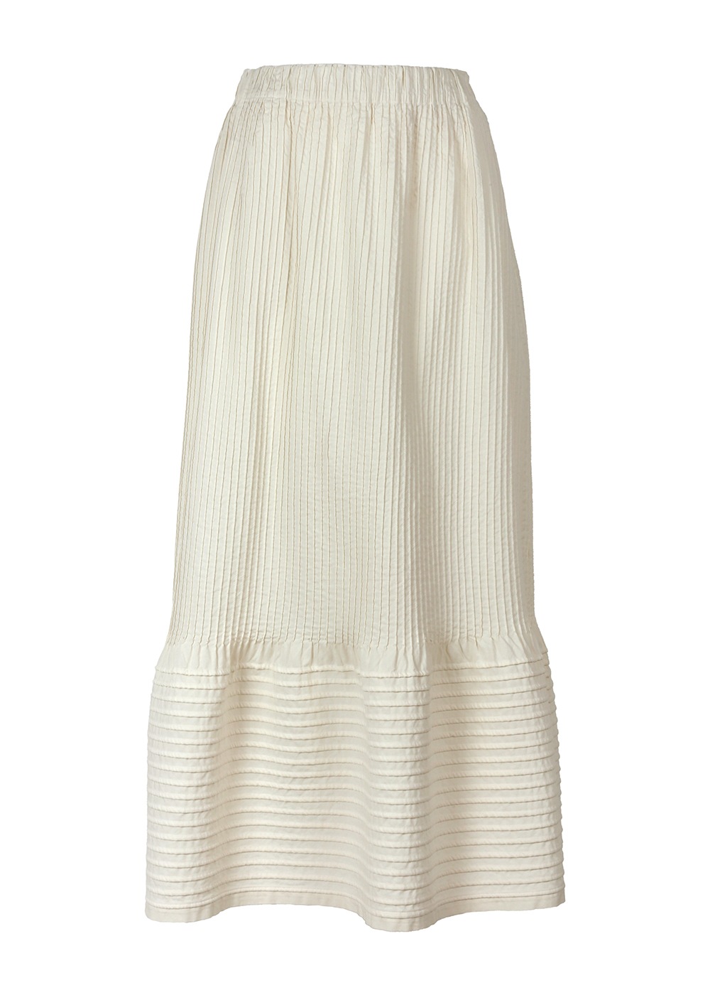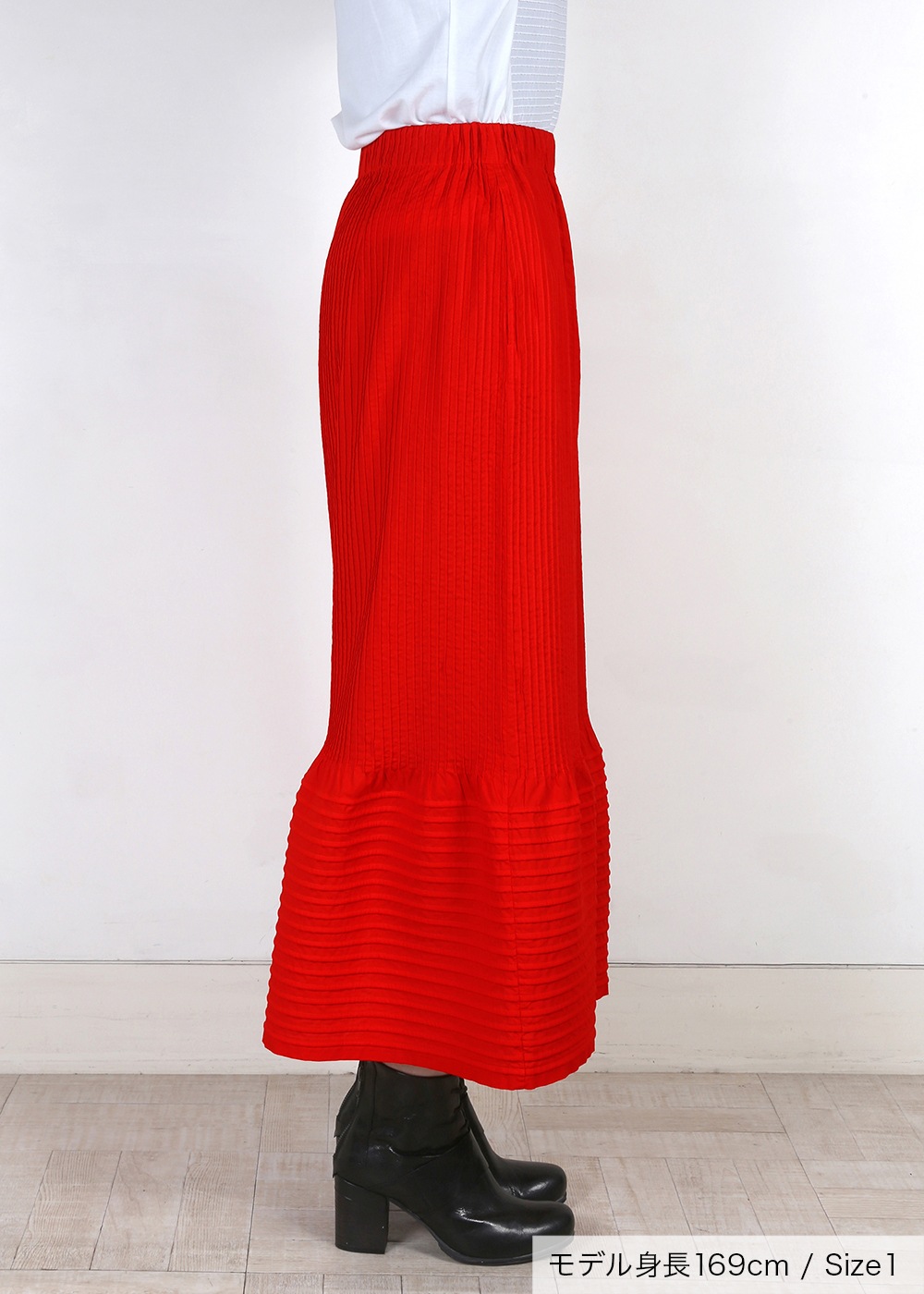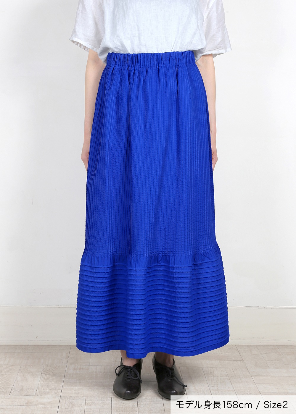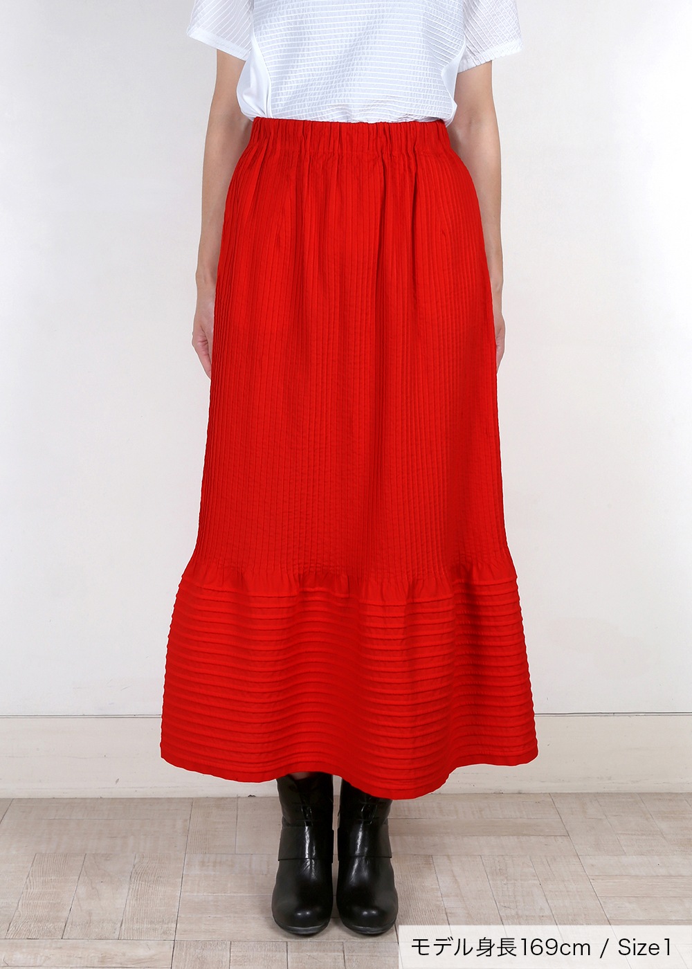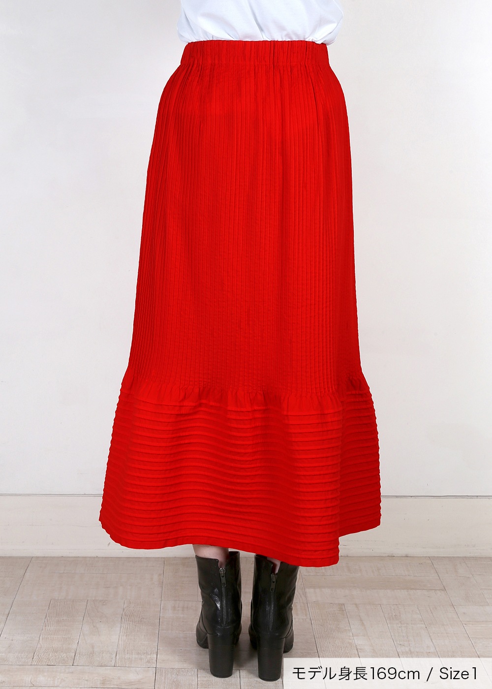 スカートのボディ部分は縦ピンタックでスマートに、裾は方向を変えた横ピンタックで弾むようなハリを持たせ、フィット&ボリュームのメリハリシルエットを作っています。
