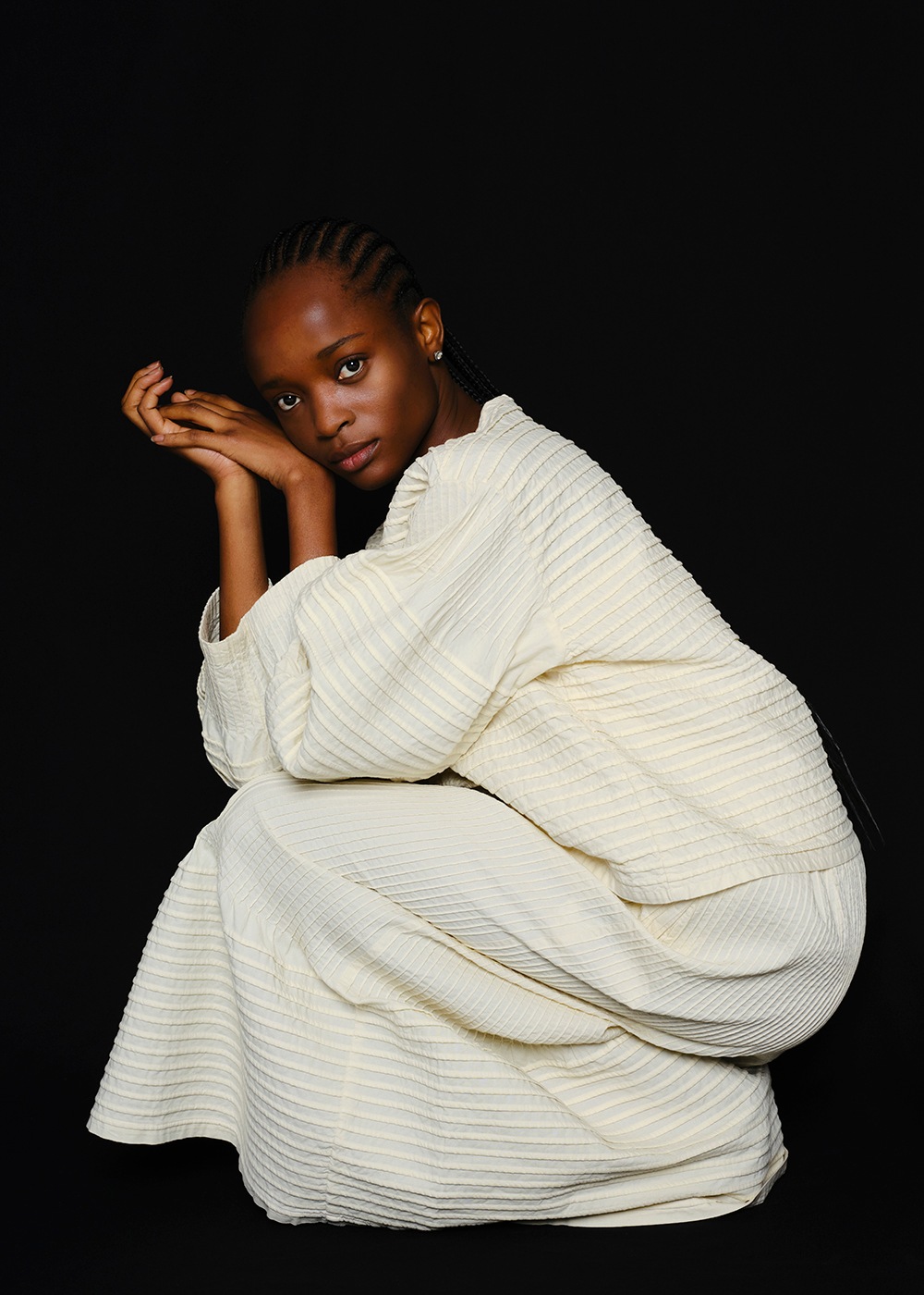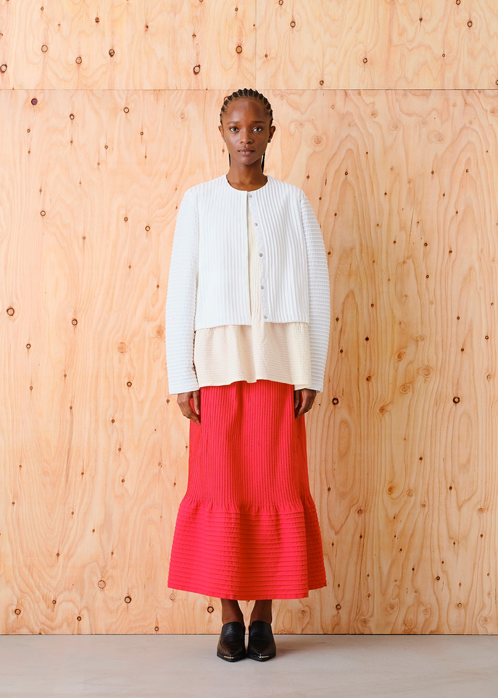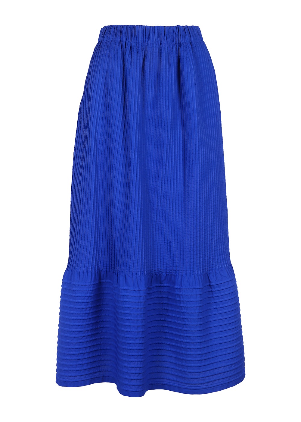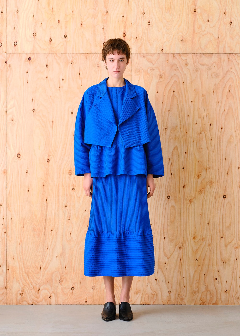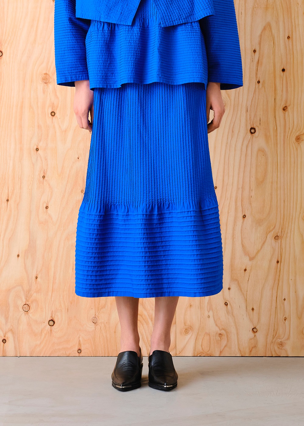 スカートのボディ部分は縦ピンタックでスマートに、裾は方向を変えた横ピンタックで弾むようなハリを持たせ、フィット&ボリュームのメリハリシルエットを作っています。