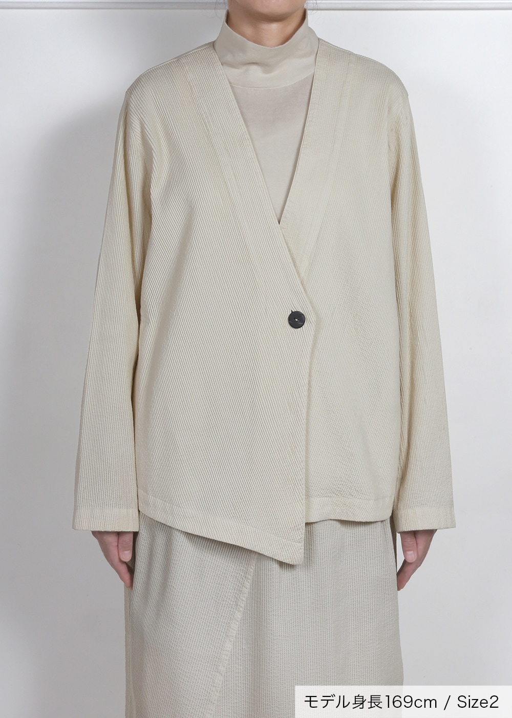 マイクロピンタックの美しさと迫力を堪能できる、リッチで上品なセットアップ。シャープな斜めのエッジを強調した深いVネックと、アシンメトリーのヘムデザインがモードなジャケットは、フォーマルシーンにも対応可能。 すっきりとしたミニマルなつくりで、ボリュームボトムとも合わせやすく、着まわしの幅が広いアイテムです。 同シリーズのスカートと組み合わせると、スタイリッシュなIラインシルエットのスーツに。