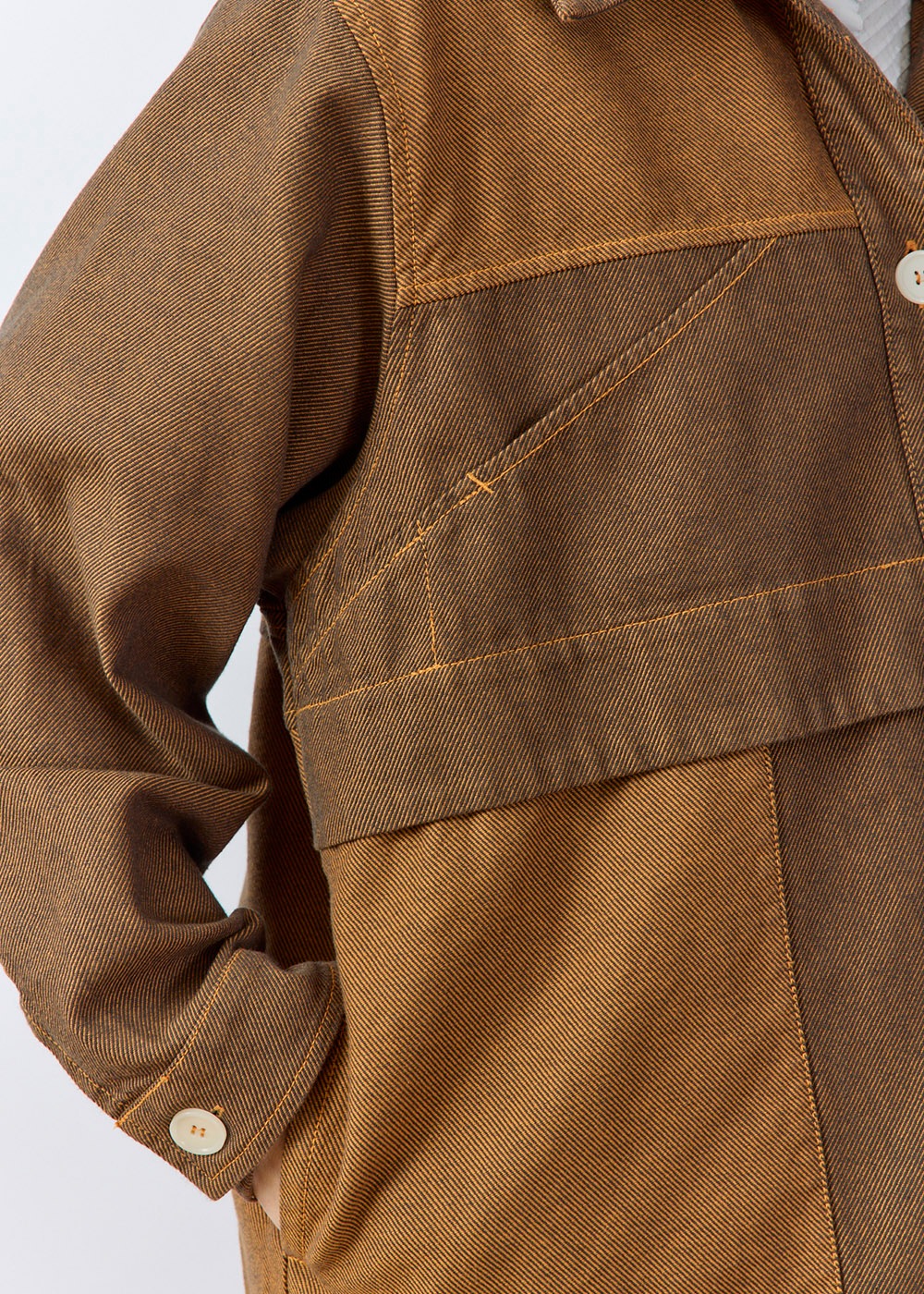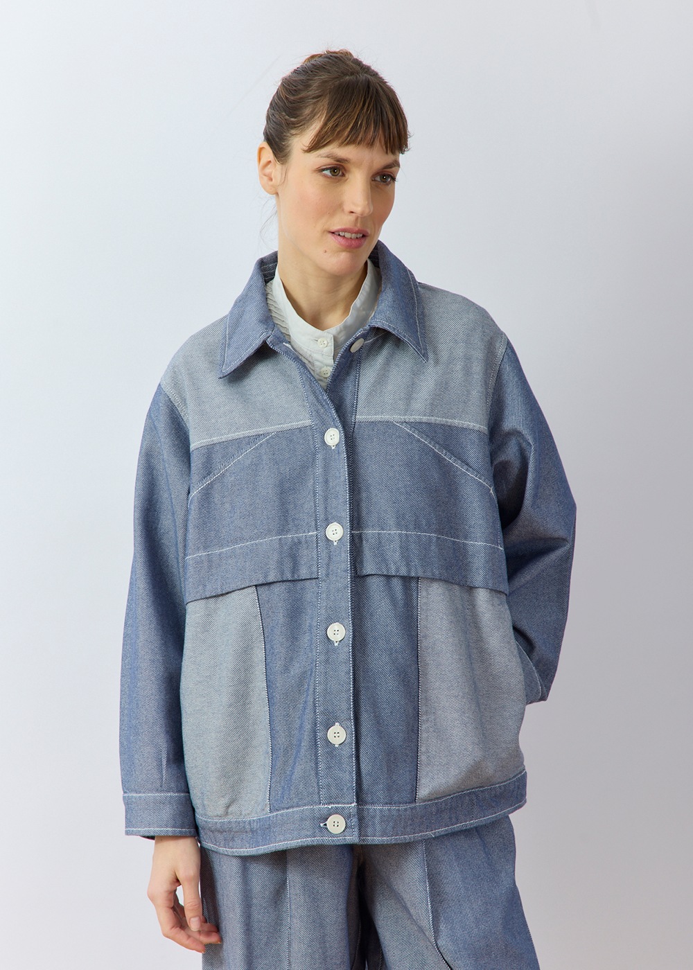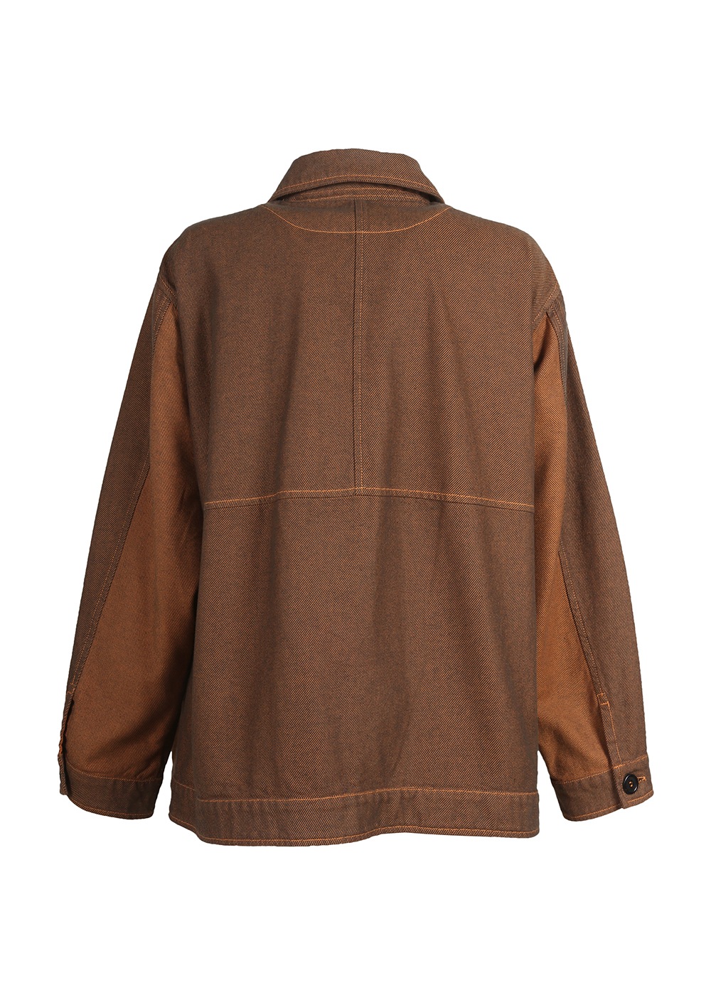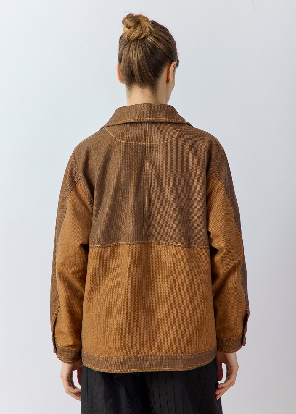 ツイル生地の裏と表を両面使いした、濃淡の配色デザインがポイントのオーバーサイズジャケット。