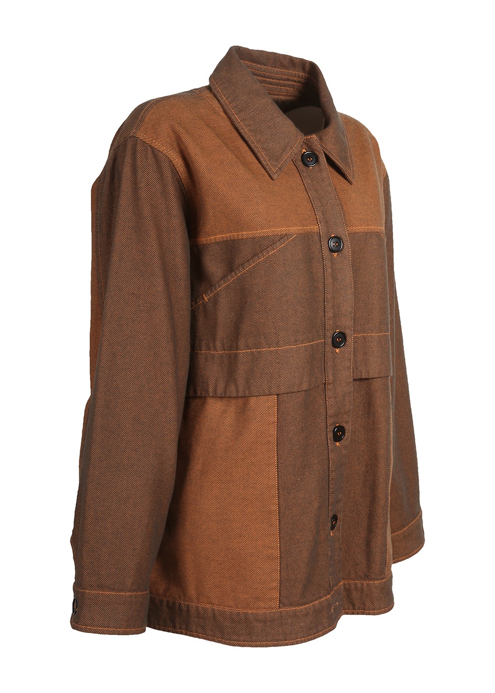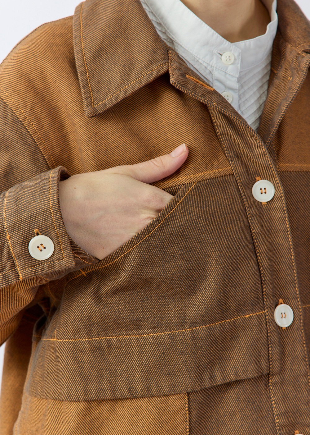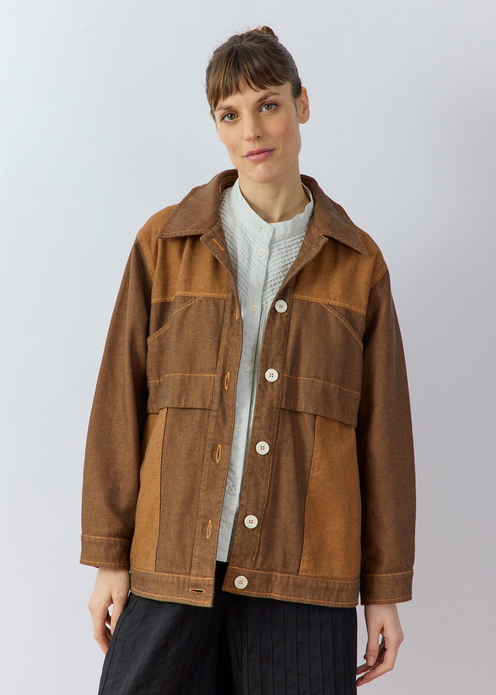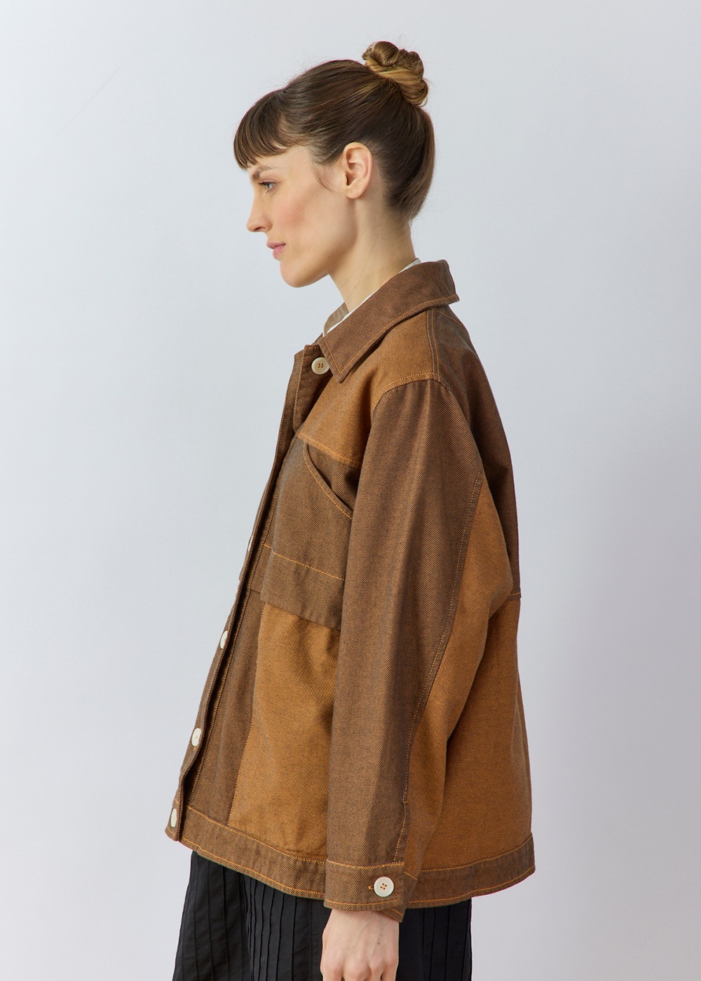 ツイル生地の裏と表を両面使いした、濃淡の配色デザインがポイントのオーバーサイズジャケット。