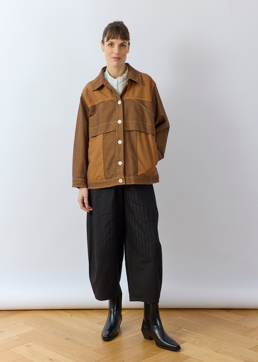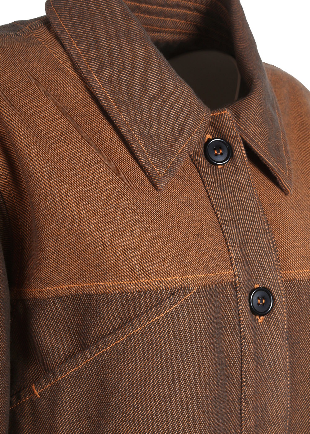 シンプルなシルエットながら、複雑な切り替えやタックなどのこだわりのディテールが入った1枚です。