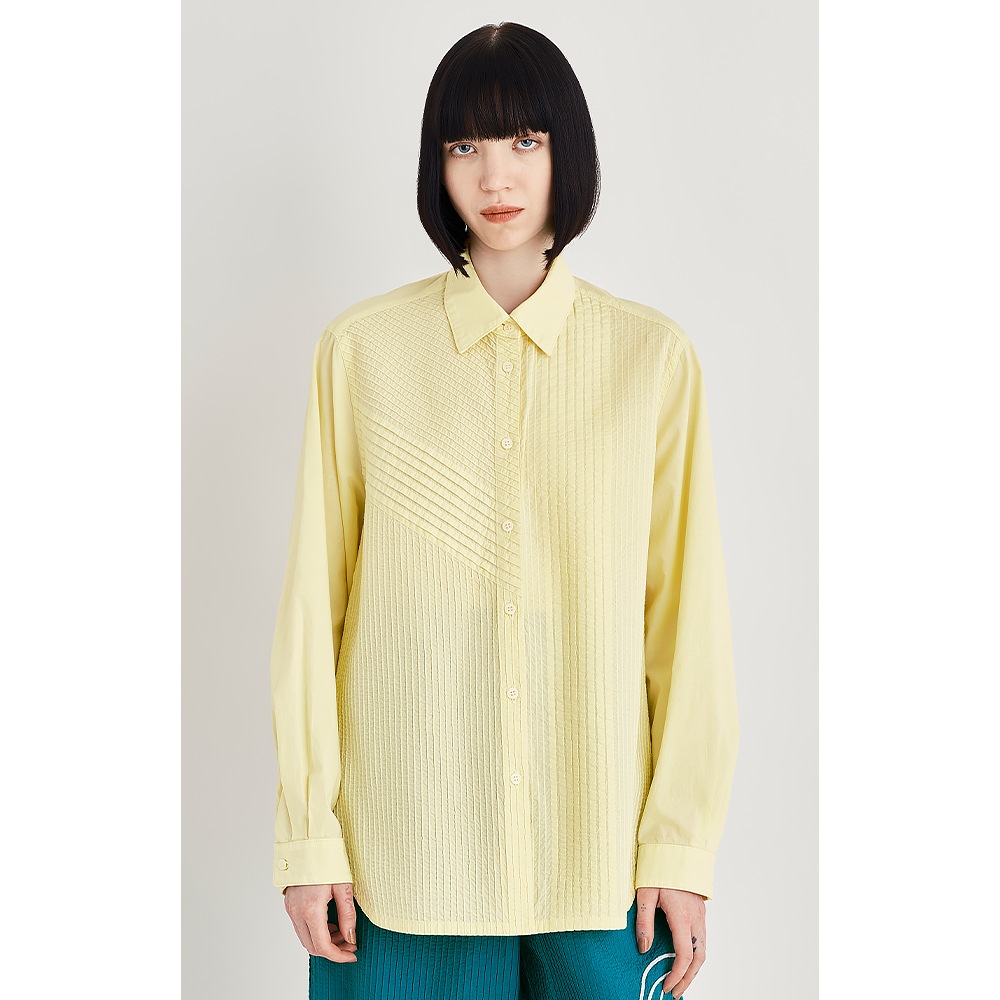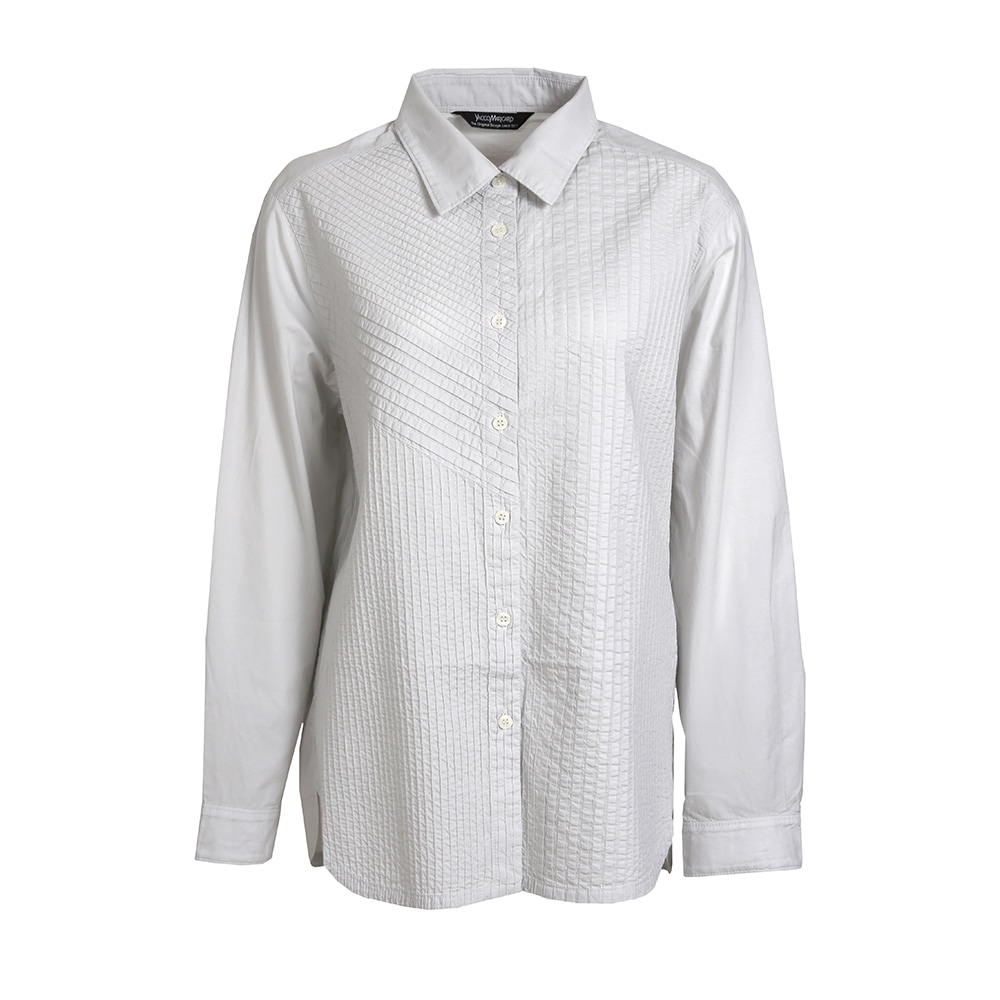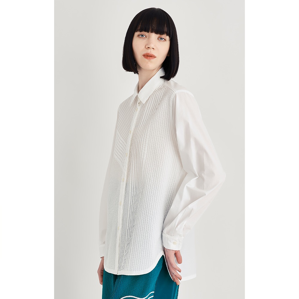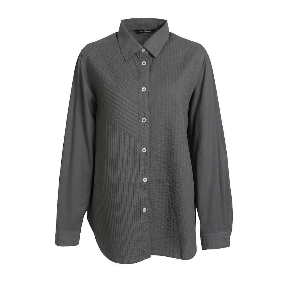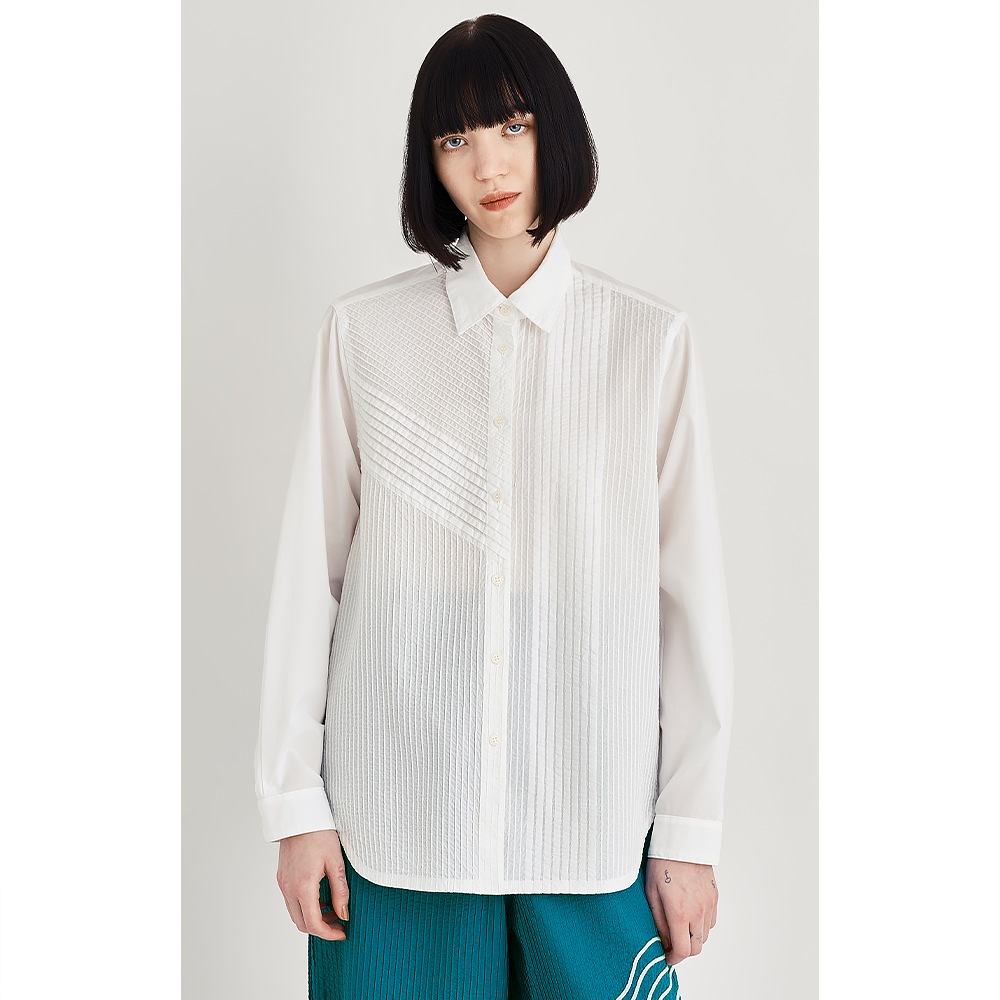 斜めと縦のラインがアクセントになった、シンプルシルエットのシャツ。