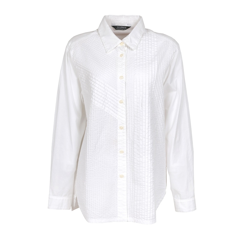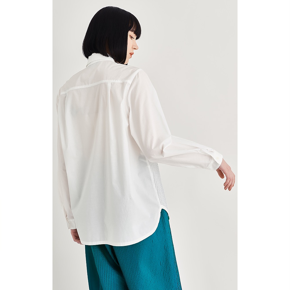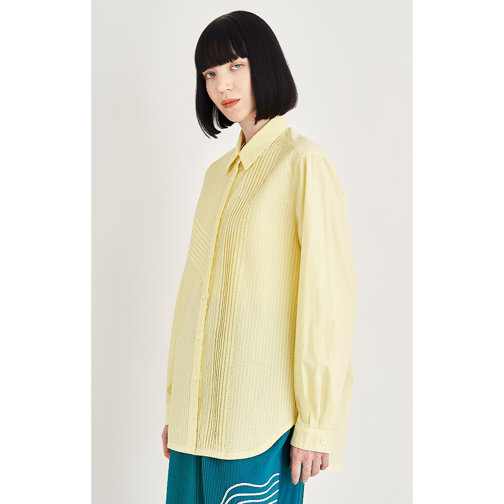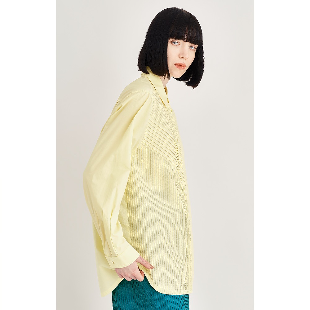 斜めと縦のラインがアクセントになった、シンプルシルエットのシャツ。