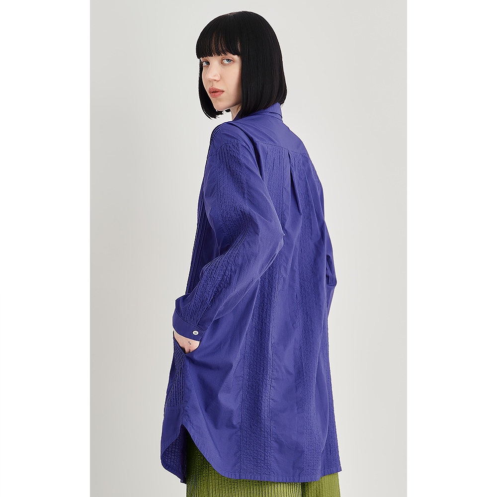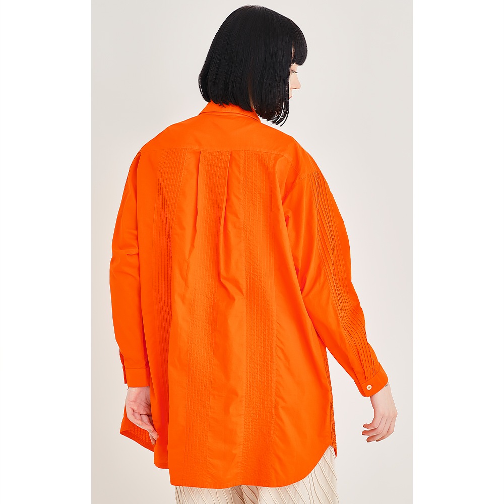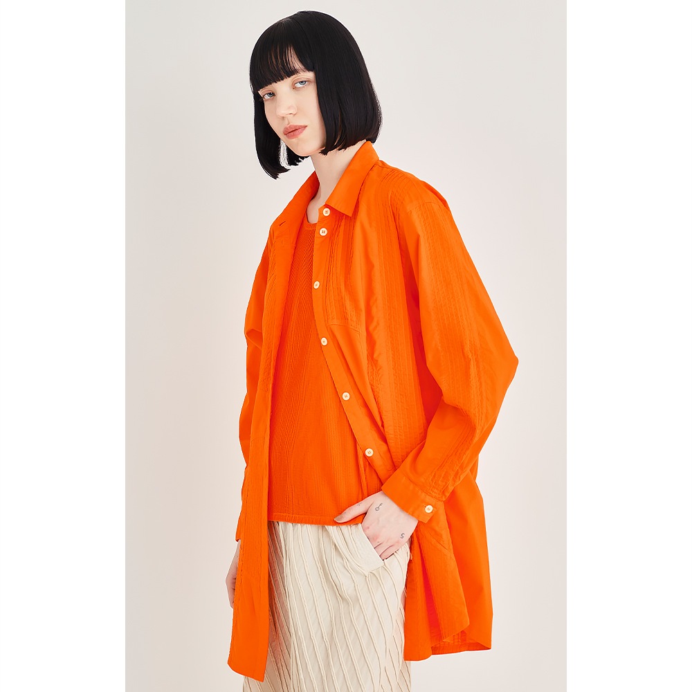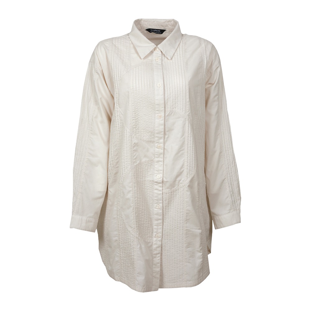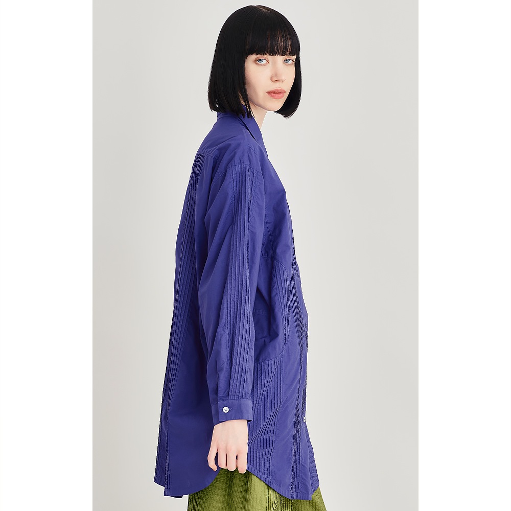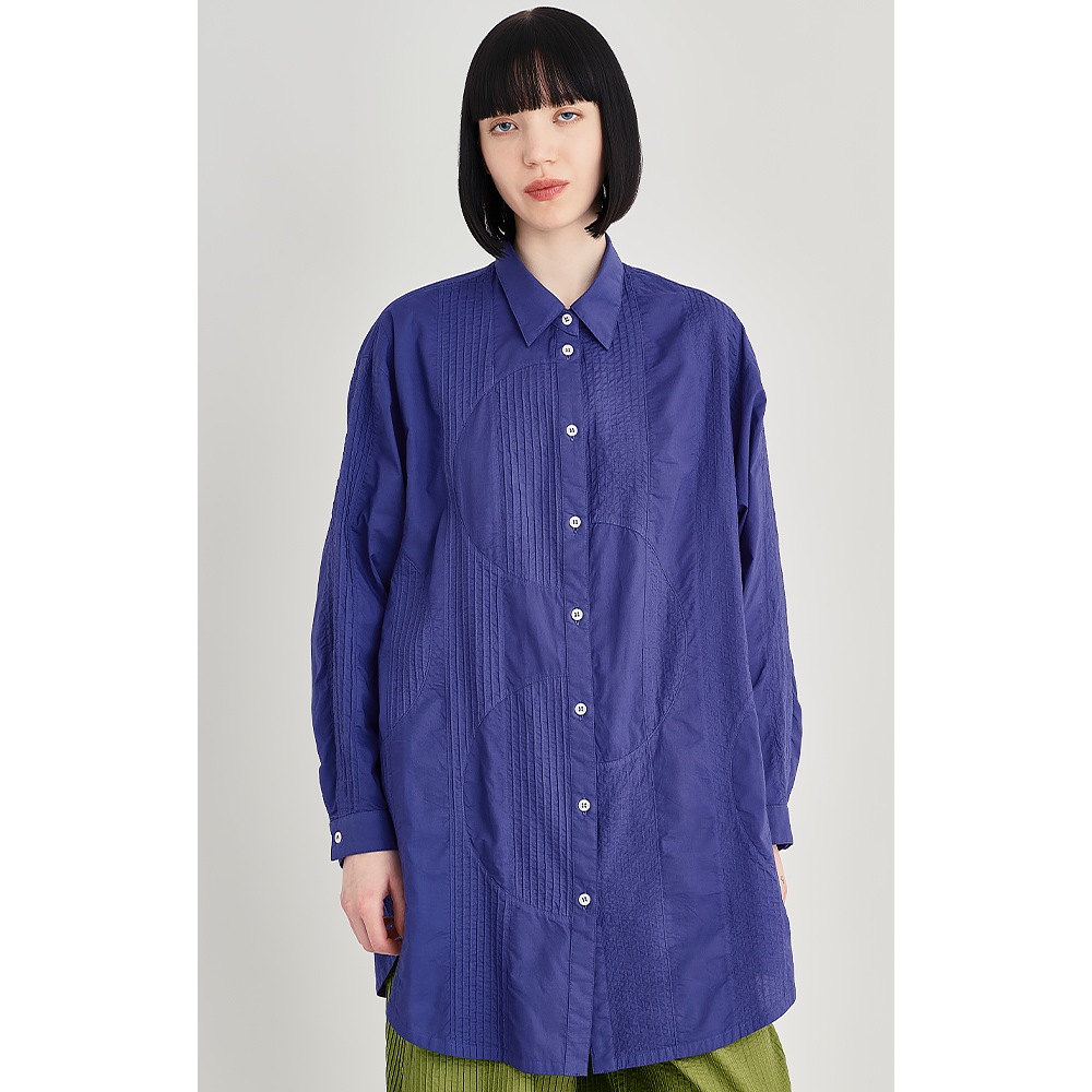 半円とピンタックの幾何学的な切り替えが、連続でデザインされたロング丈シャツ。