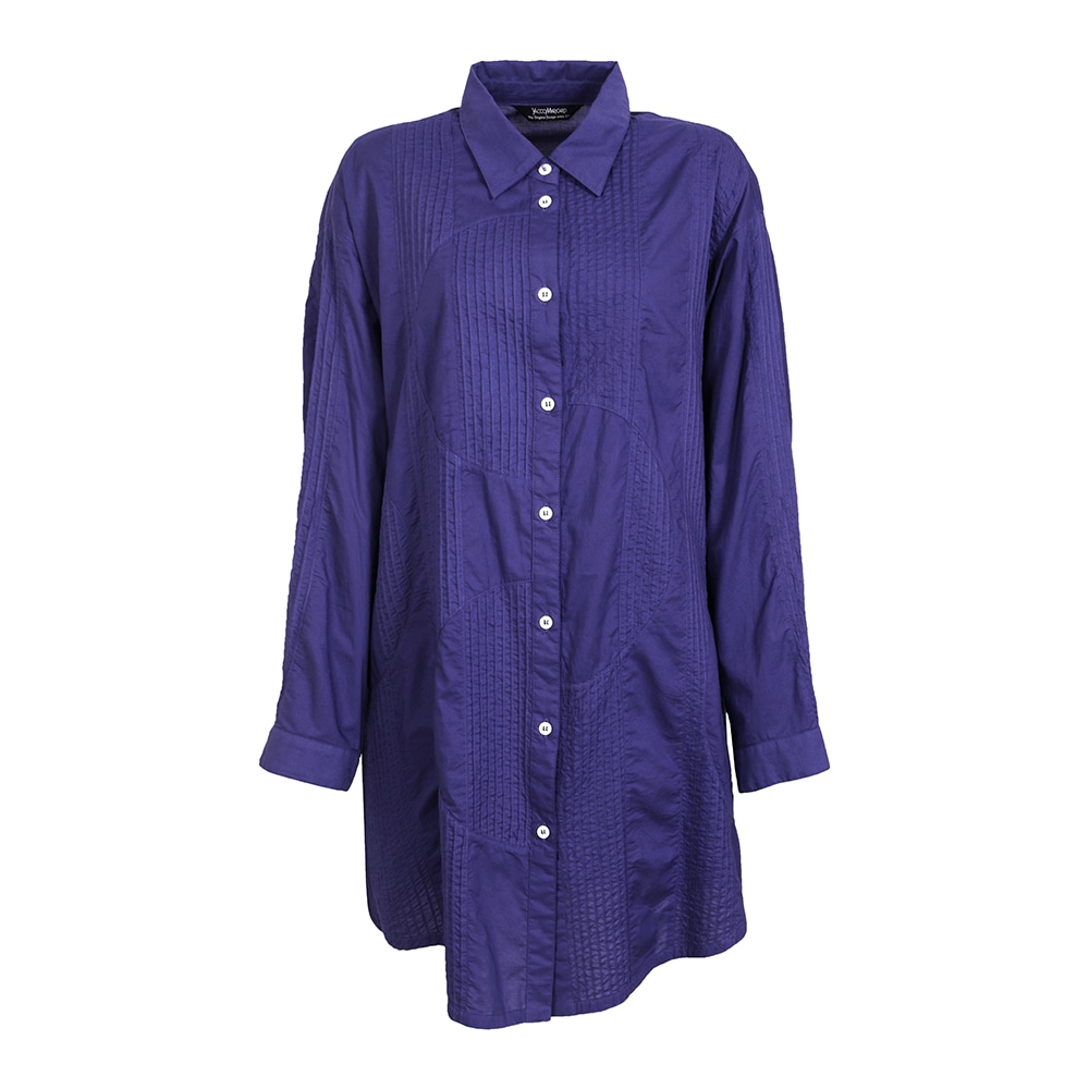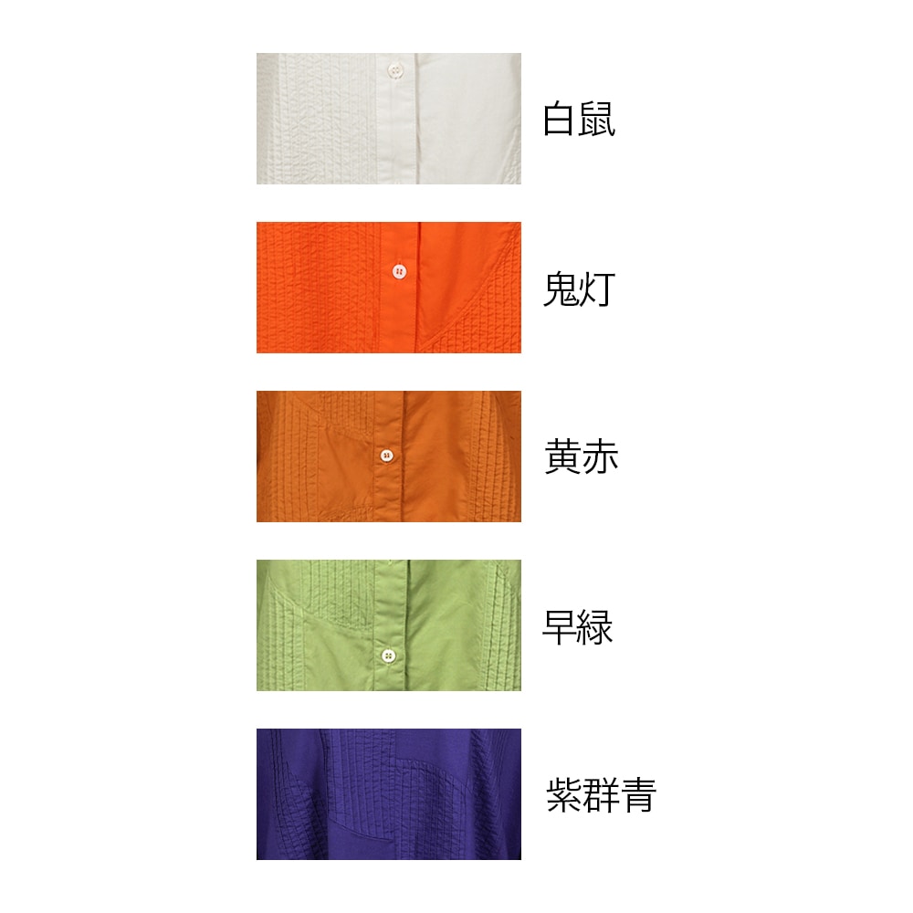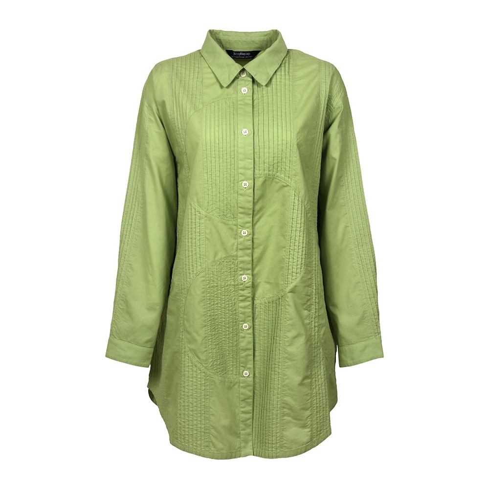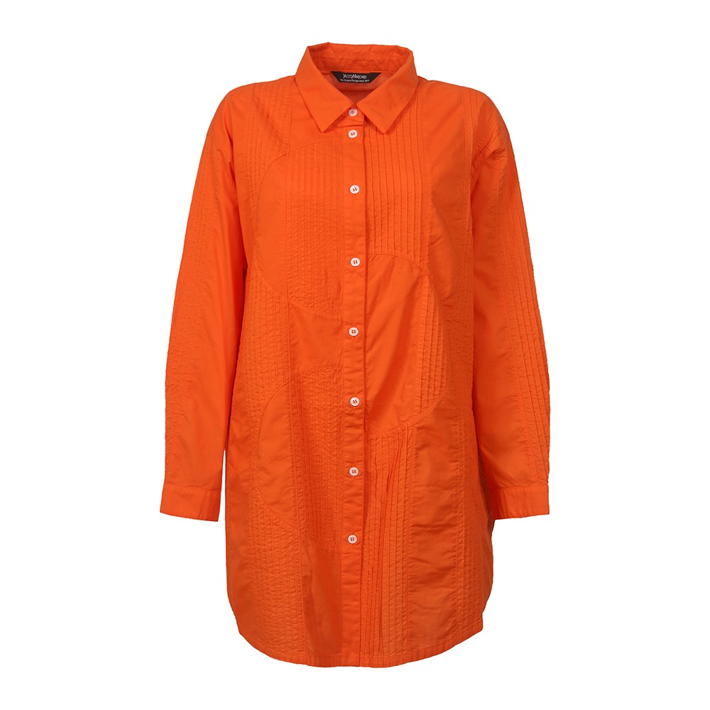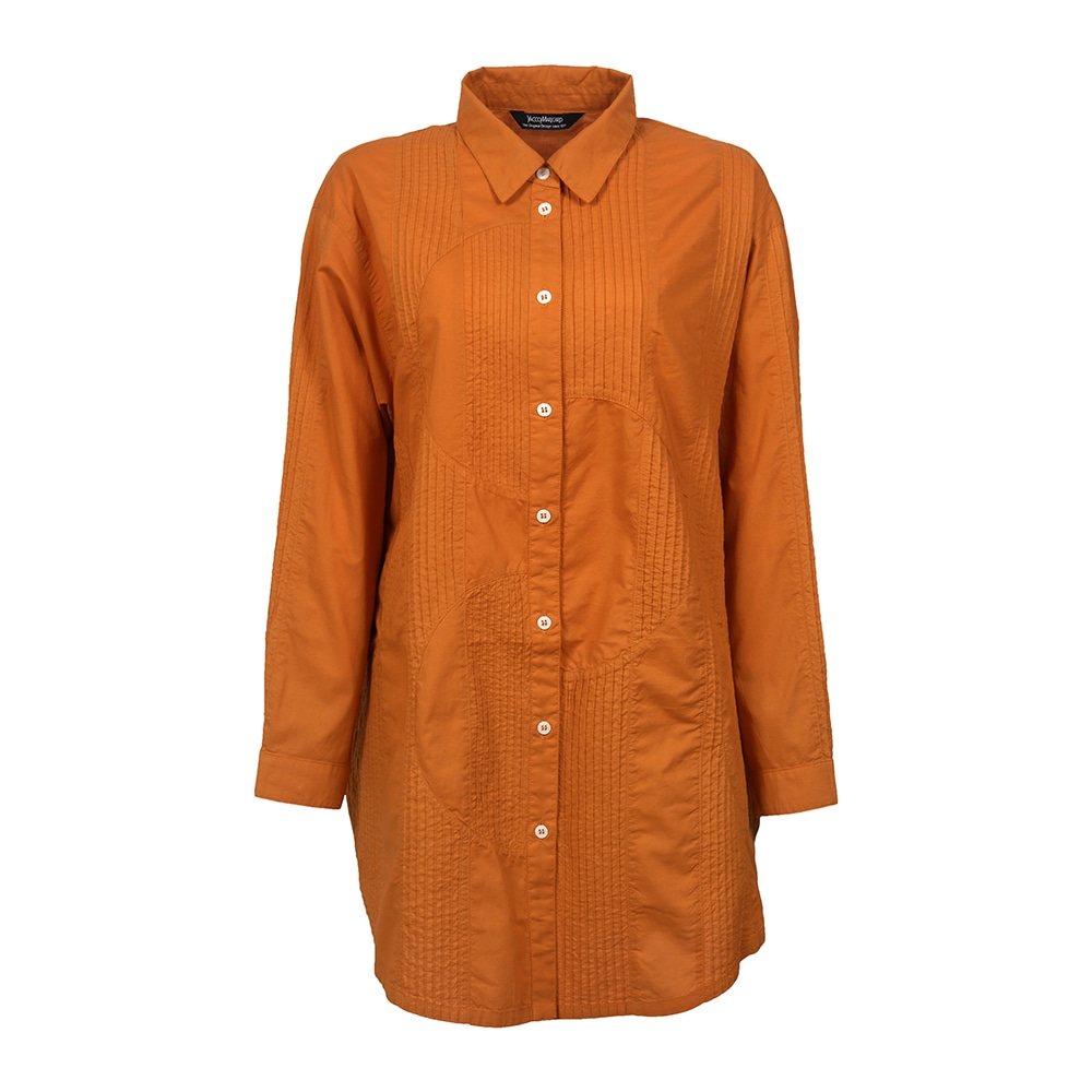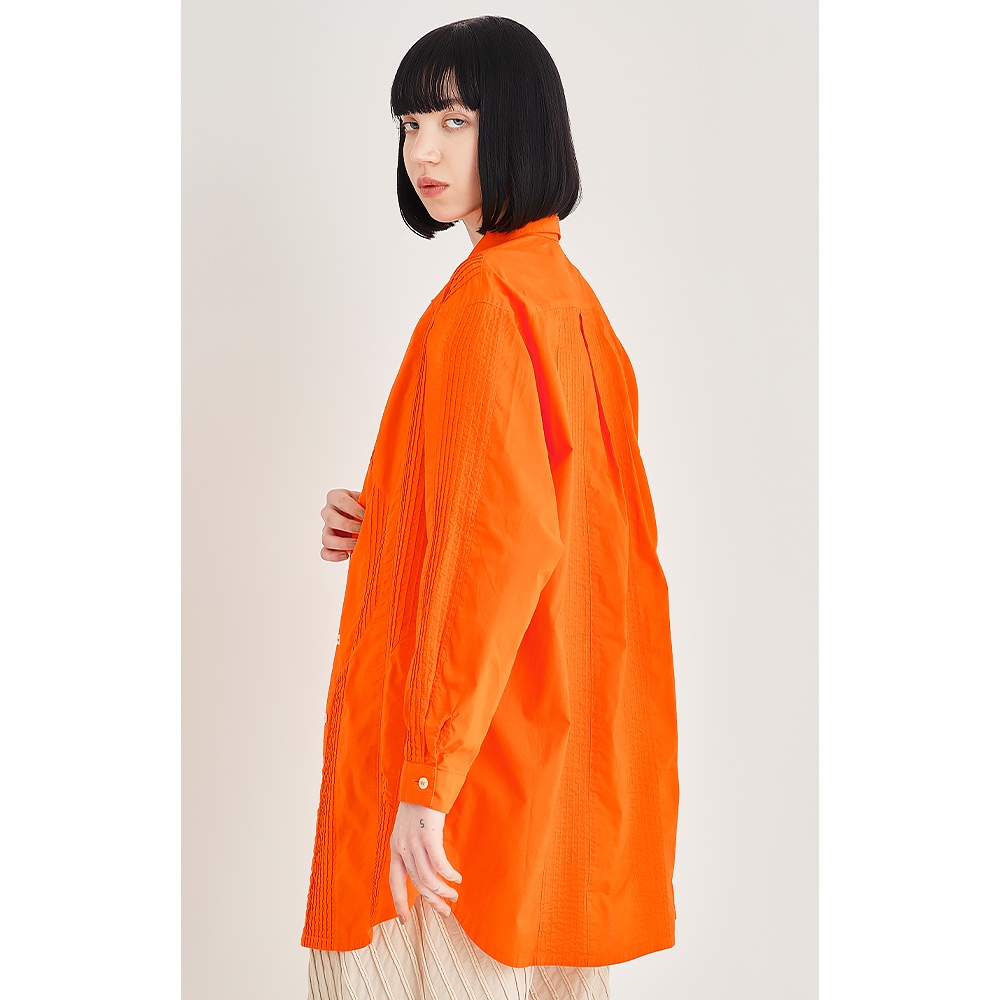 半円とピンタックの幾何学的な切り替えが、連続でデザインされたロング丈シャツ。
