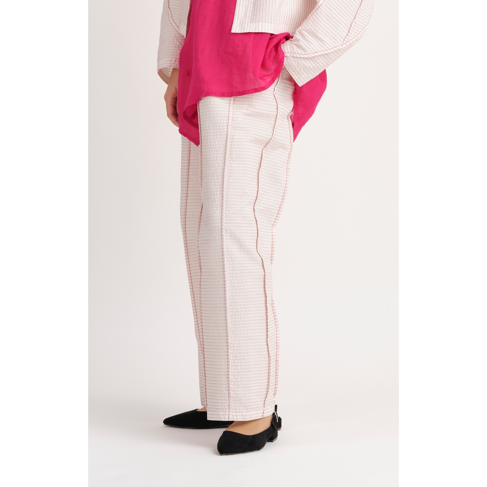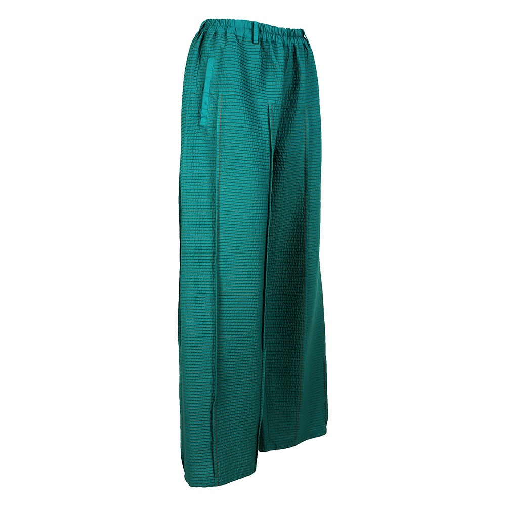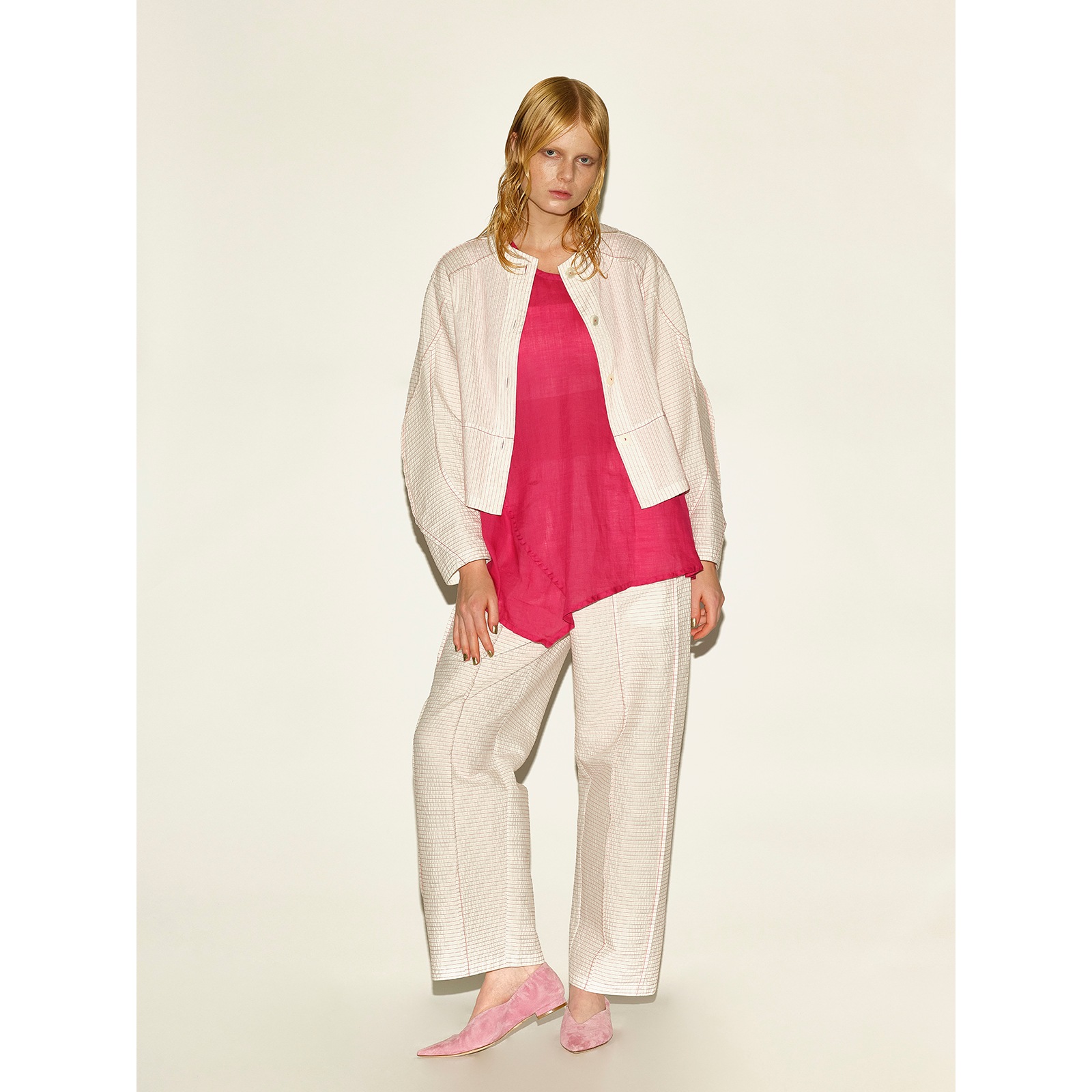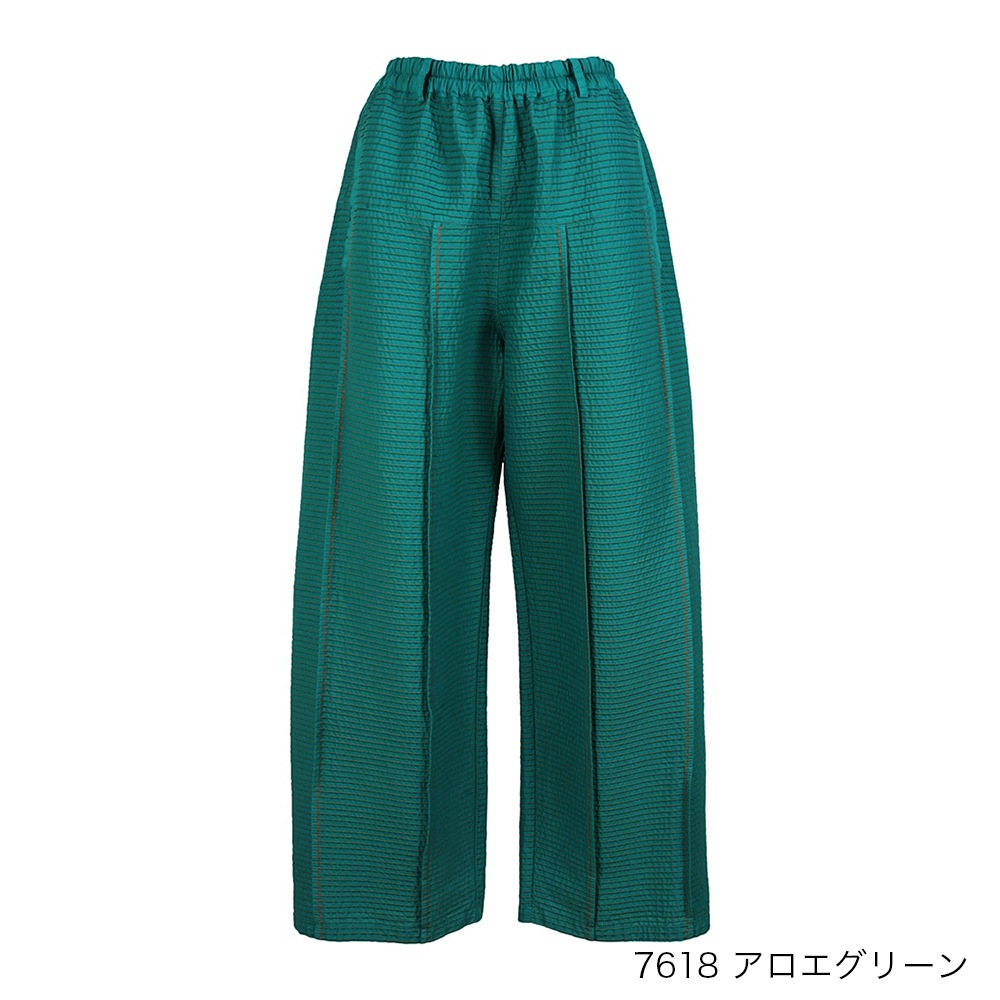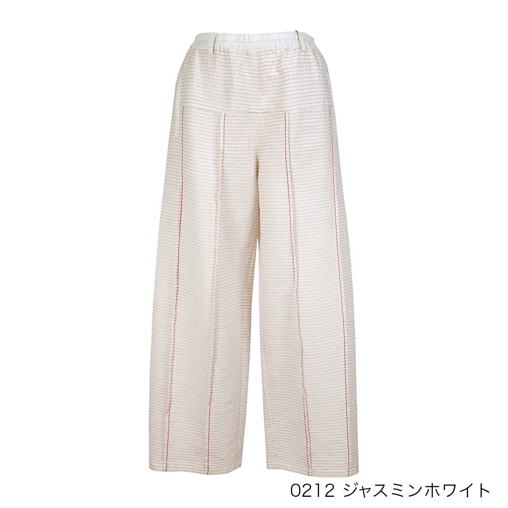 配色カラーのピンタックの上から、さらに部分的につまみ上げて縫ったピンチングタックが立体的でユニーク。 立ち上がったタックが縦ラインを強調し、足長効果をUPさせるストレートパンツです。 身体の動きに自然に沿いながらフォルムを保つ、横方向のピンタックの独特なハリ感が特徴。縦にはぎ合わせることで、シャープなシルエットに仕上げました。 同シリーズのシャツジャケットとのスーツアップで、よりモード感がUPします。