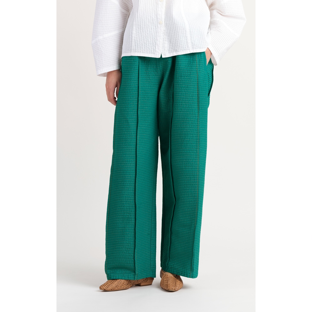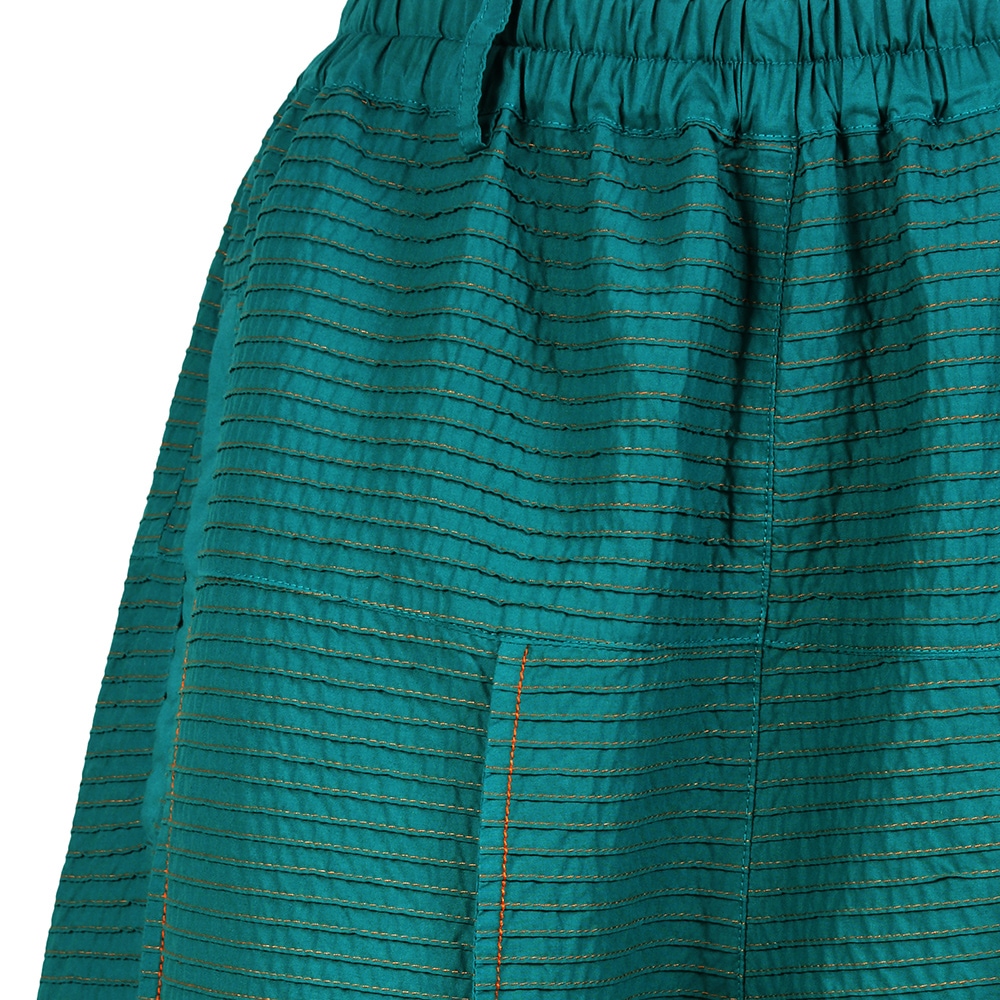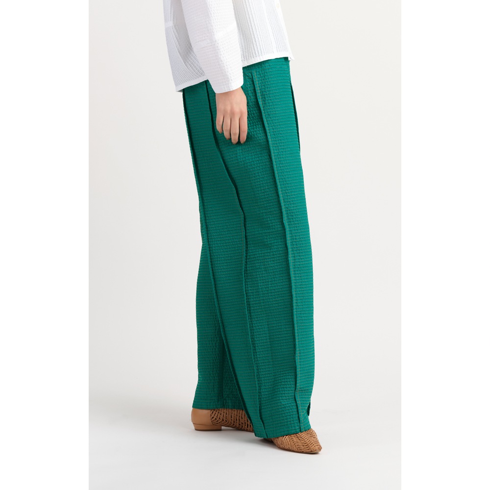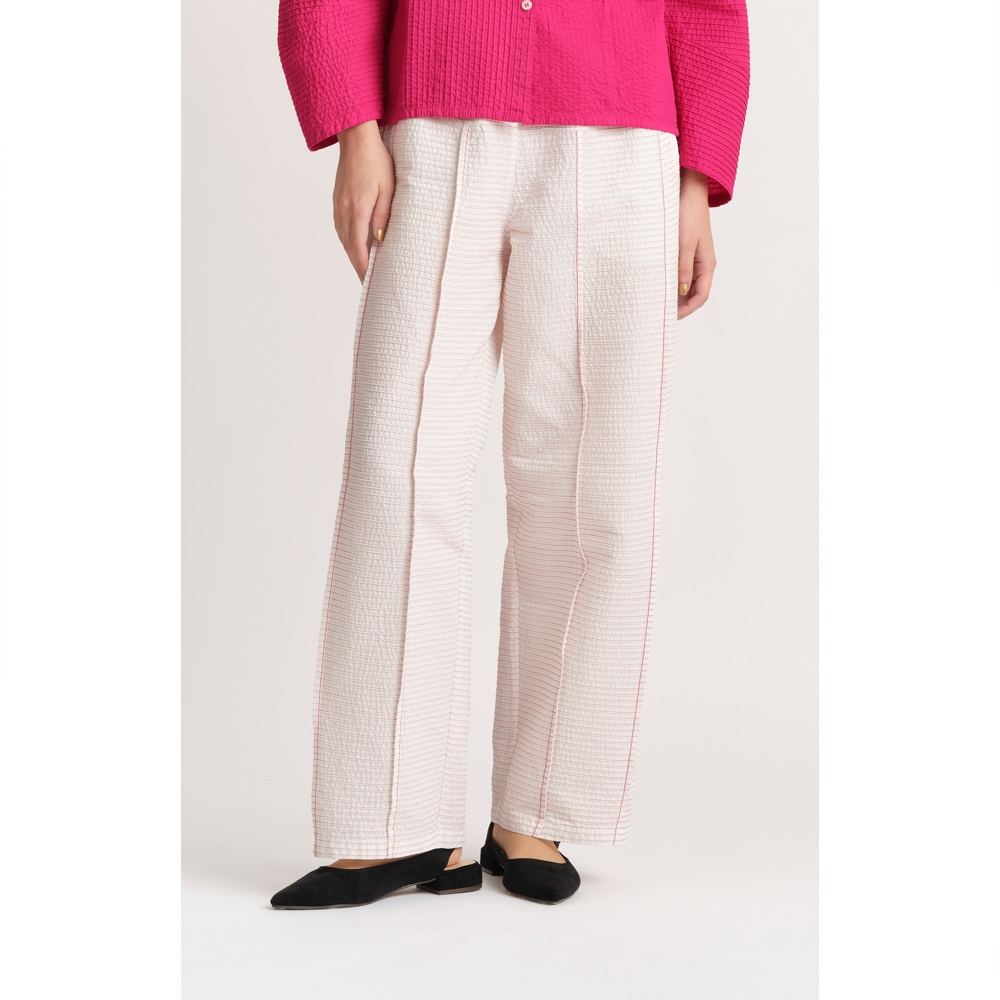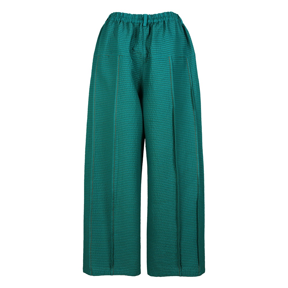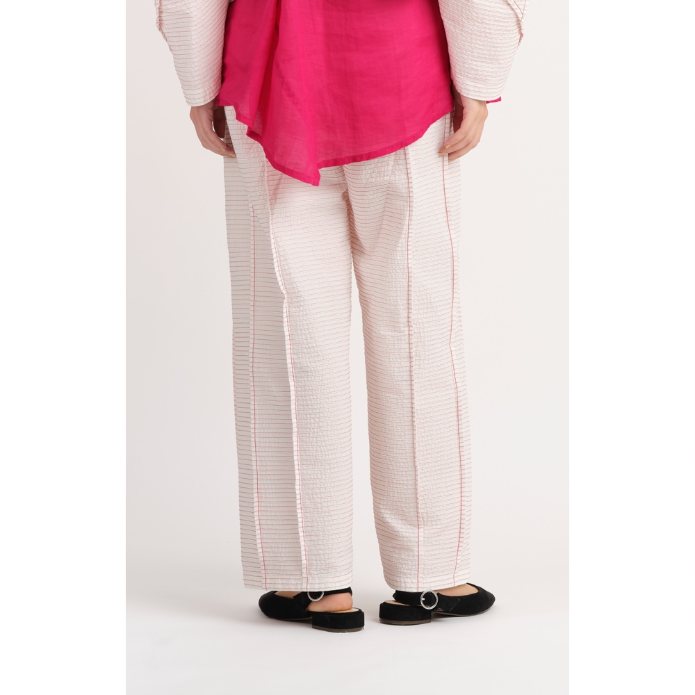 配色カラーのピンタックの上から、さらに部分的につまみ上げて縫ったピンチングタックが立体的でユニーク。 立ち上がったタックが縦ラインを強調し、足長効果をUPさせるストレートパンツです。 身体の動きに自然に沿いながらフォルムを保つ、横方向のピンタックの独特なハリ感が特徴。縦にはぎ合わせることで、シャープなシルエットに仕上げました。 同シリーズのシャツジャケットとのスーツアップで、よりモード感がUPします。