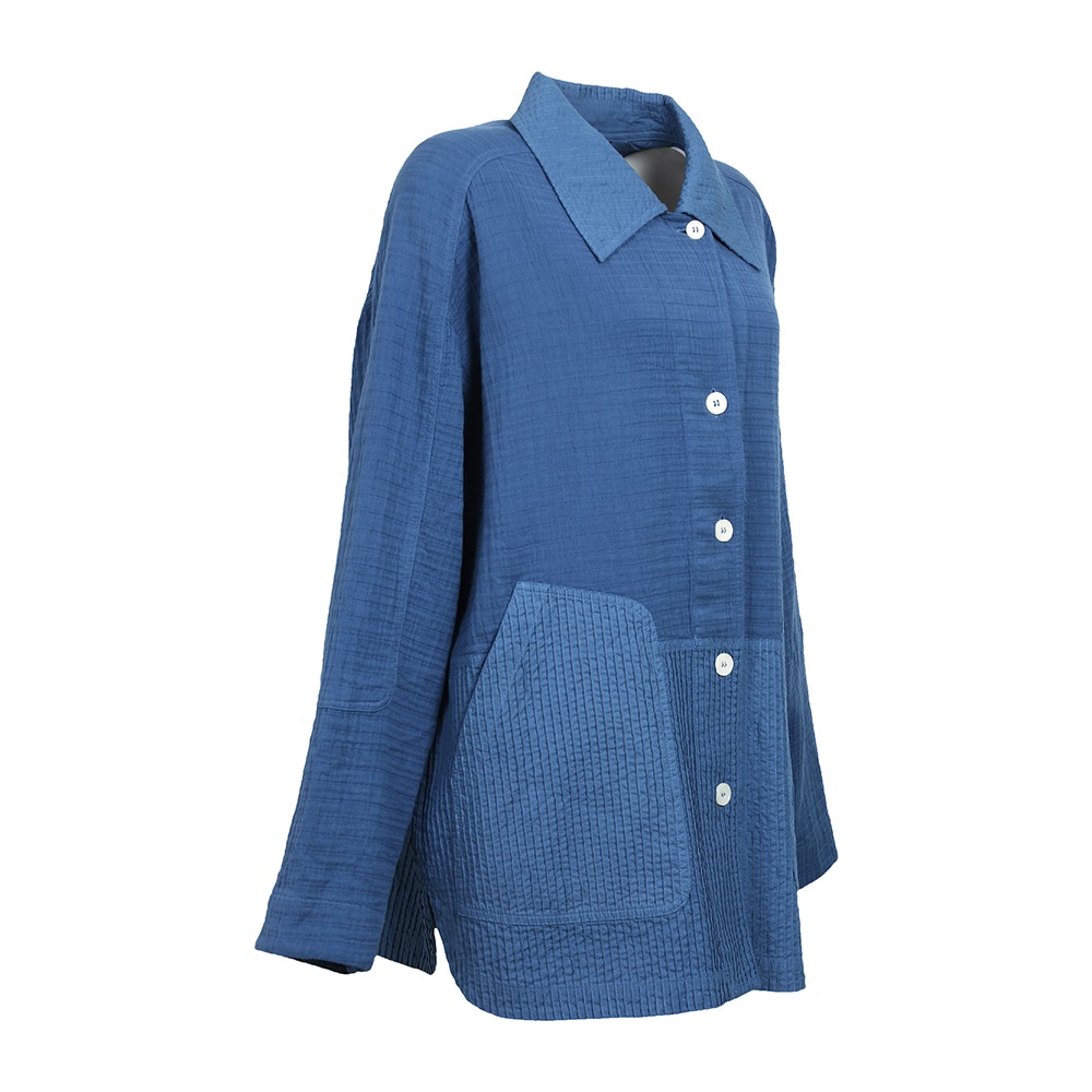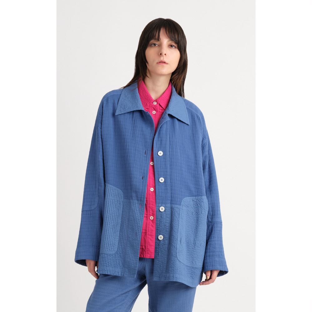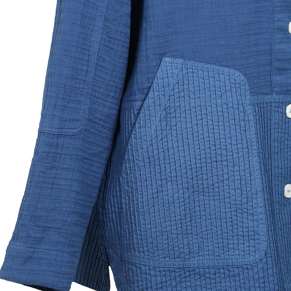 ナチュラルな表面感が魅力のガーゼクレープ素材とシャープなピンタック、全く違う質感のMIXが新鮮なジャケット。